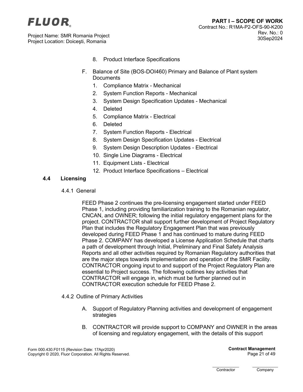 Project Name: SMR Romania Project Project Location: , Romania PART I – SCOPE OF WORK Contract No.: R1MA-P2-OFS-90-K200 Rev. No.: 0 30Sep2024 Form 000.430.F0115 (Revision Date: 17Apr2020) Copyright © 2020, Fluor Corporation. All Rights Reserved. Contract Management Page 21 of 49 Contractor Company 8. Product Interface Specifications F. Balance of Site (BOS-DOI460) Primary and Balance of Plant system Documents 1. Compliance Matrix - Mechanical 2. System Function Reports - Mechanical 3. System Design Specification Updates - Mechanical 4. Deleted 5. Compliance Matrix - Electrical 6. Deleted 7. System Function Reports - Electrical 8. System Design Specification Updates - Electrical 9. System Design Description Updates - Electrical 10. Single Line Diagrams - Electrical 11. Equipment Lists - Electrical 12. Product Interface Specifications – Electrical 4.4 Licensing 4.4.1 General FEED Phase 2 continues the pre-licensing engagement started under FEED Phase 1, including providing familiarization training to the Romanian regulator, CNCAN, and OWNER; following the initial regulatory engagement plans for the project. CONTRACTOR shall support further development of Project Regulatory Plan that includes the Regulatory Engagement Plan that was previously developed during FEED Phase 1 and has continued to mature during FEED Phase 2. COMPANY has developed a License Application Schedule that charts a path of development through Initial, Preliminary and Final Safety Analysis Reports and all other activities required by Romanian Regulatory authorities that are the major steps towards implementation and operation of the SMR Facility. CONTRACTOR ongoing input to and support of the Project Regulatory Plan are essential to Project success. The following outlines key activities that CONTRACTOR will engage in, which must be further planned out in CONTRACTOR execution schedule for FEED Phase 2. 4.4.2 Outline of Primary Activities A. Support of Regulatory Planning activities and development of engagement strategies B. CONTRACTOR will provide support to COMPANY and OWNER in the areas of licensing and regulatory engagement, with the details of this support
