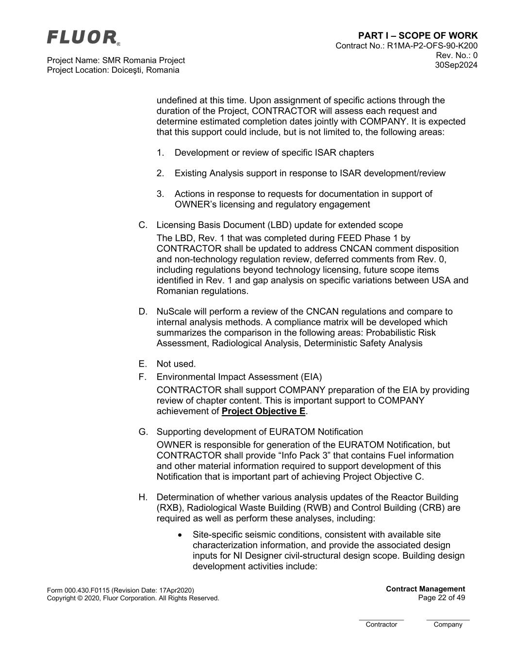 Project Name: SMR Romania Project Project Location: , Romania PART I – SCOPE OF WORK Contract No.: R1MA-P2-OFS-90-K200 Rev. No.: 0 30Sep2024 Form 000.430.F0115 (Revision Date: 17Apr2020) Copyright © 2020, Fluor Corporation. All Rights Reserved. Contract Management Page 22 of 49 Contractor Company undefined at this time. Upon assignment of specific actions through the duration of the Project, CONTRACTOR will assess each request and determine estimated completion dates jointly with COMPANY. It is expected that this support could include, but is not limited to, the following areas: 1. Development or review of specific ISAR chapters 2. Existing Analysis support in response to ISAR development/review 3. Actions in response to requests for documentation in support of OWNER’s licensing and regulatory engagement C. Licensing Basis Document (LBD) update for extended scope The LBD, Rev. 1 that was completed during FEED Phase 1 by CONTRACTOR shall be updated to address CNCAN comment disposition and non-technology regulation review, deferred comments from Rev. 0, including regulations beyond technology licensing, future scope items identified in Rev. 1 and gap analysis on specific variations between USA and Romanian regulations. D. NuScale will perform a review of the CNCAN regulations and compare to internal analysis methods. A compliance matrix will be developed which summarizes the comparison in the following areas: Probabilistic Risk Assessment, Radiological Analysis, Deterministic Safety Analysis E. Not used. F. Environmental Impact Assessment (EIA) CONTRACTOR shall support COMPANY preparation of the EIA by providing review of chapter content. This is important support to COMPANY achievement of Project Objective E. G. Supporting development of EURATOM Notification OWNER is responsible for generation of the EURATOM Notification, but CONTRACTOR shall provide “Info Pack 3” that contains Fuel information and other material information required to support development of this Notification that is important part of achieving Project Objective C. H. Determination of whether various analysis updates of the Reactor Building (RXB), Radiological Waste Building (RWB) and Control Building (CRB) are required as well as perform these analyses, including: Site-specific seismic conditions, consistent with available site characterization information, and provide the associated design inputs for NI Designer civil-structural design scope. Building design development activities include: