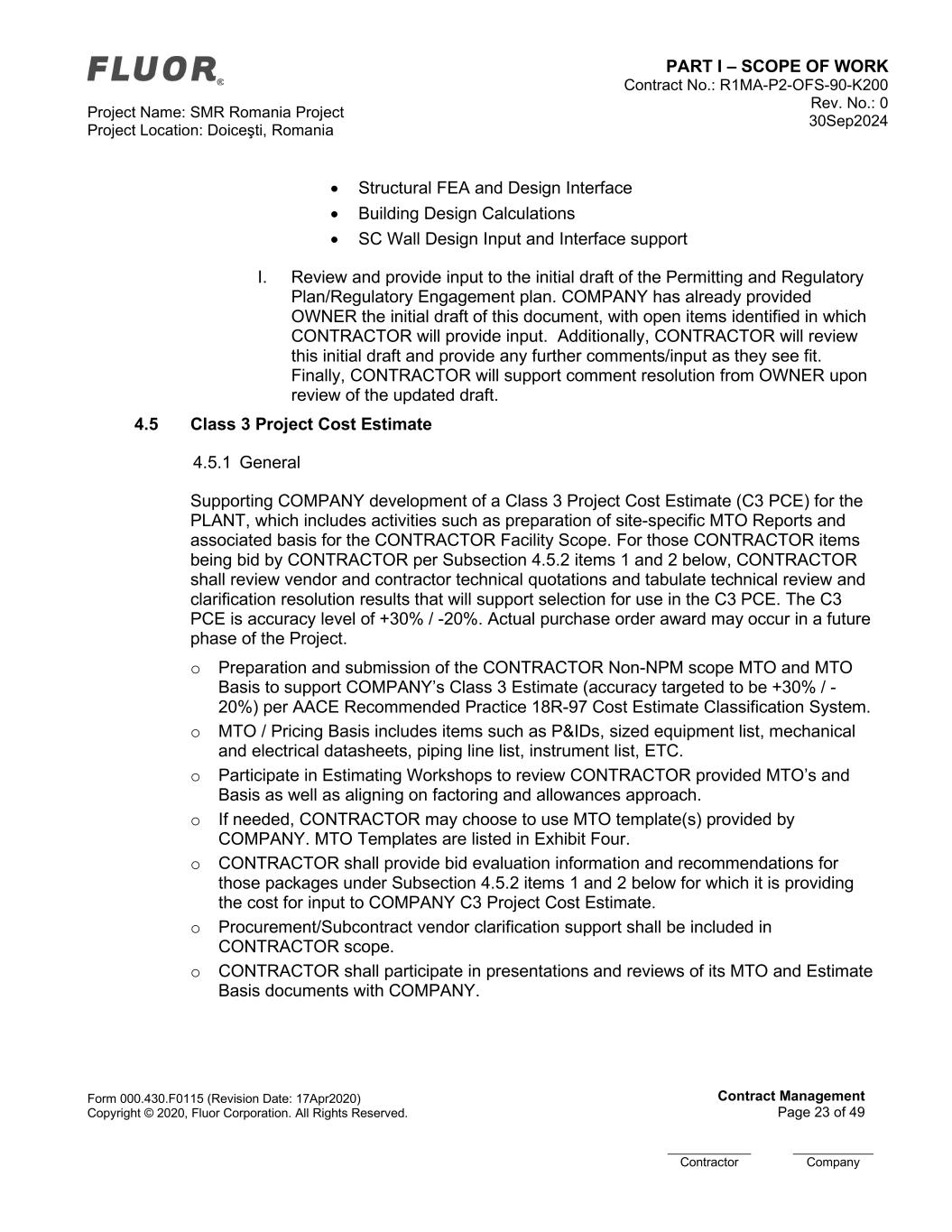 Project Name: SMR Romania Project Project Location: , Romania PART I – SCOPE OF WORK Contract No.: R1MA-P2-OFS-90-K200 Rev. No.: 0 30Sep2024 Form 000.430.F0115 (Revision Date: 17Apr2020) Copyright © 2020, Fluor Corporation. All Rights Reserved. Contract Management Page 23 of 49 Contractor Company Structural FEA and Design Interface Building Design Calculations SC Wall Design Input and Interface support I. Review and provide input to the initial draft of the Permitting and Regulatory Plan/Regulatory Engagement plan. COMPANY has already provided OWNER the initial draft of this document, with open items identified in which CONTRACTOR will provide input. Additionally, CONTRACTOR will review this initial draft and provide any further comments/input as they see fit. Finally, CONTRACTOR will support comment resolution from OWNER upon review of the updated draft. 4.5 Class 3 Project Cost Estimate 4.5.1 General Supporting COMPANY development of a Class 3 Project Cost Estimate (C3 PCE) for the PLANT, which includes activities such as preparation of site-specific MTO Reports and associated basis for the CONTRACTOR Facility Scope. For those CONTRACTOR items being bid by CONTRACTOR per Subsection 4.5.2 items 1 and 2 below, CONTRACTOR shall review vendor and contractor technical quotations and tabulate technical review and clarification resolution results that will support selection for use in the C3 PCE. The C3 PCE is accuracy level of +30% / -20%. Actual purchase order award may occur in a future phase of the Project. o Preparation and submission of the CONTRACTOR Non-NPM scope MTO and MTO Basis to support COMPANY’s Class 3 Estimate (accuracy targeted to be +30% / - 20%) per AACE Recommended Practice 18R-97 Cost Estimate Classification System. o MTO / Pricing Basis includes items such as P&IDs, sized equipment list, mechanical and electrical datasheets, piping line list, instrument list, ETC. o Participate in Estimating Workshops to review CONTRACTOR provided MTO’s and Basis as well as aligning on factoring and allowances approach. o If needed, CONTRACTOR may choose to use MTO template(s) provided by COMPANY. MTO Templates are listed in Exhibit Four. o CONTRACTOR shall provide bid evaluation information and recommendations for those packages under Subsection 4.5.2 items 1 and 2 below for which it is providing the cost for input to COMPANY C3 Project Cost Estimate. o Procurement/Subcontract vendor clarification support shall be included in CONTRACTOR scope. o CONTRACTOR shall participate in presentations and reviews of its MTO and Estimate Basis documents with COMPANY.