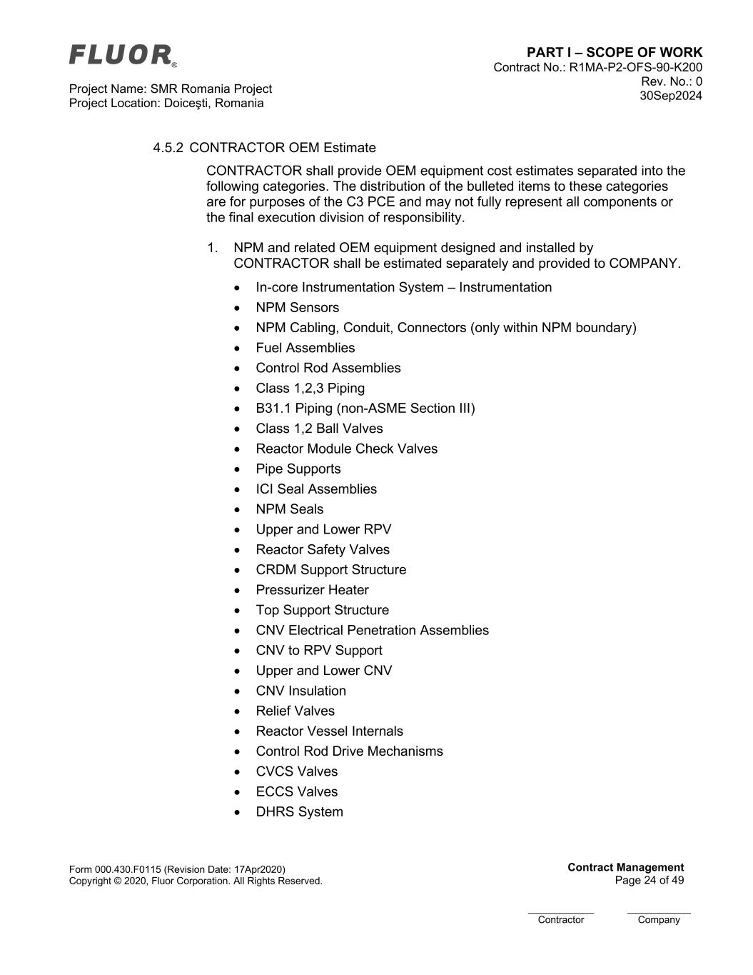 Project Name: SMR Romania Project Project Location: , Romania PART I – SCOPE OF WORK Contract No.: R1MA-P2-OFS-90-K200 Rev. No.: 0 30Sep2024 Form 000.430.F0115 (Revision Date: 17Apr2020) Copyright © 2020, Fluor Corporation. All Rights Reserved. Contract Management Page 24 of 49 Contractor Company 4.5.2 CONTRACTOR OEM Estimate CONTRACTOR shall provide OEM equipment cost estimates separated into the following categories. The distribution of the bulleted items to these categories are for purposes of the C3 PCE and may not fully represent all components or the final execution division of responsibility. 1. NPM and related OEM equipment designed and installed by CONTRACTOR shall be estimated separately and provided to COMPANY. In-core Instrumentation System – Instrumentation NPM Sensors NPM Cabling, Conduit, Connectors (only within NPM boundary) Fuel Assemblies Control Rod Assemblies Class 1,2,3 Piping B31.1 Piping (non-ASME Section III) Class 1,2 Ball Valves Reactor Module Check Valves Pipe Supports ICI Seal Assemblies NPM Seals Upper and Lower RPV Reactor Safety Valves CRDM Support Structure Pressurizer Heater Top Support Structure CNV Electrical Penetration Assemblies CNV to RPV Support Upper and Lower CNV CNV Insulation Relief Valves Reactor Vessel Internals Control Rod Drive Mechanisms CVCS Valves ECCS Valves DHRS System