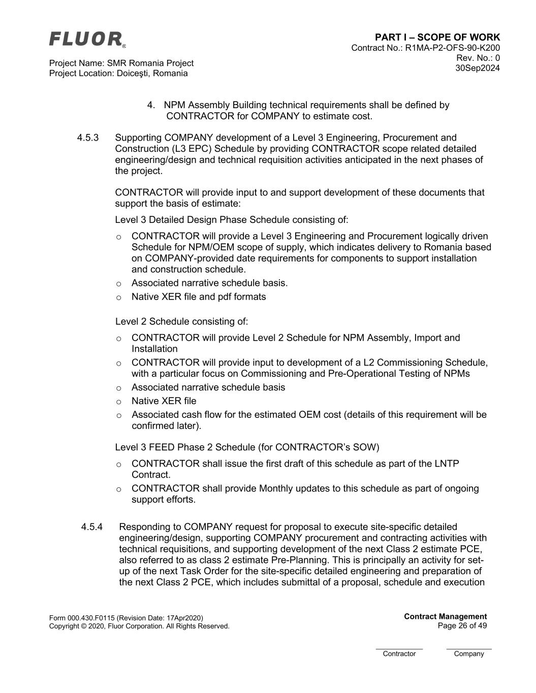 Project Name: SMR Romania Project Project Location: , Romania PART I – SCOPE OF WORK Contract No.: R1MA-P2-OFS-90-K200 Rev. No.: 0 30Sep2024 Form 000.430.F0115 (Revision Date: 17Apr2020) Copyright © 2020, Fluor Corporation. All Rights Reserved. Contract Management Page 26 of 49 Contractor Company 4. NPM Assembly Building technical requirements shall be defined by CONTRACTOR for COMPANY to estimate cost. 4.5.3 Supporting COMPANY development of a Level 3 Engineering, Procurement and Construction (L3 EPC) Schedule by providing CONTRACTOR scope related detailed engineering/design and technical requisition activities anticipated in the next phases of the project. CONTRACTOR will provide input to and support development of these documents that support the basis of estimate: Level 3 Detailed Design Phase Schedule consisting of: o CONTRACTOR will provide a Level 3 Engineering and Procurement logically driven Schedule for NPM/OEM scope of supply, which indicates delivery to Romania based on COMPANY-provided date requirements for components to support installation and construction schedule. o Associated narrative schedule basis. o Native XER file and pdf formats Level 2 Schedule consisting of: o CONTRACTOR will provide Level 2 Schedule for NPM Assembly, Import and Installation o CONTRACTOR will provide input to development of a L2 Commissioning Schedule, with a particular focus on Commissioning and Pre-Operational Testing of NPMs o Associated narrative schedule basis o Native XER file o Associated cash flow for the estimated OEM cost (details of this requirement will be confirmed later). Level 3 FEED Phase 2 Schedule (for CONTRACTOR’s SOW) o CONTRACTOR shall issue the first draft of this schedule as part of the LNTP Contract. o CONTRACTOR shall provide Monthly updates to this schedule as part of ongoing support efforts. 4.5.4 Responding to COMPANY request for proposal to execute site-specific detailed engineering/design, supporting COMPANY procurement and contracting activities with technical requisitions, and supporting development of the next Class 2 estimate PCE, also referred to as class 2 estimate Pre-Planning. This is principally an activity for set- up of the next Task Order for the site-specific detailed engineering and preparation of the next Class 2 PCE, which includes submittal of a proposal, schedule and execution