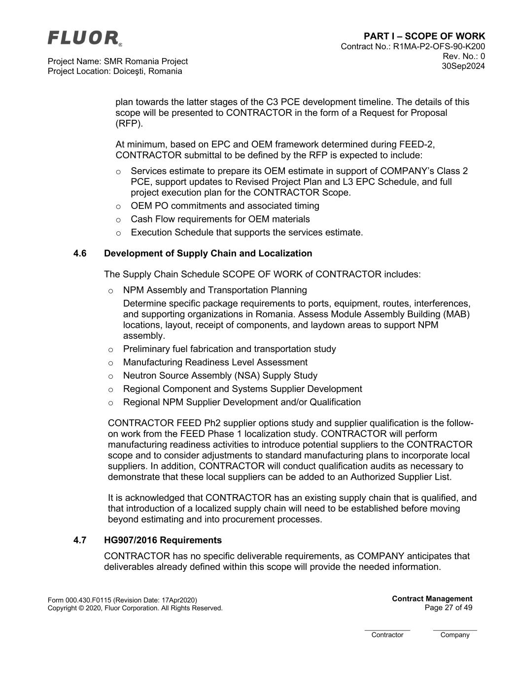 Project Name: SMR Romania Project Project Location: , Romania PART I – SCOPE OF WORK Contract No.: R1MA-P2-OFS-90-K200 Rev. No.: 0 30Sep2024 Form 000.430.F0115 (Revision Date: 17Apr2020) Copyright © 2020, Fluor Corporation. All Rights Reserved. Contract Management Page 27 of 49 Contractor Company plan towards the latter stages of the C3 PCE development timeline. The details of this scope will be presented to CONTRACTOR in the form of a Request for Proposal (RFP). At minimum, based on EPC and OEM framework determined during FEED-2, CONTRACTOR submittal to be defined by the RFP is expected to include: o Services estimate to prepare its OEM estimate in support of COMPANY’s Class 2 PCE, support updates to Revised Project Plan and L3 EPC Schedule, and full project execution plan for the CONTRACTOR Scope. o OEM PO commitments and associated timing o Cash Flow requirements for OEM materials o Execution Schedule that supports the services estimate. 4.6 Development of Supply Chain and Localization The Supply Chain Schedule SCOPE OF WORK of CONTRACTOR includes: o NPM Assembly and Transportation Planning Determine specific package requirements to ports, equipment, routes, interferences, and supporting organizations in Romania. Assess Module Assembly Building (MAB) locations, layout, receipt of components, and laydown areas to support NPM assembly. o Preliminary fuel fabrication and transportation study o Manufacturing Readiness Level Assessment o Neutron Source Assembly (NSA) Supply Study o Regional Component and Systems Supplier Development o Regional NPM Supplier Development and/or Qualification CONTRACTOR FEED Ph2 supplier options study and supplier qualification is the follow- on work from the FEED Phase 1 localization study. CONTRACTOR will perform manufacturing readiness activities to introduce potential suppliers to the CONTRACTOR scope and to consider adjustments to standard manufacturing plans to incorporate local suppliers. In addition, CONTRACTOR will conduct qualification audits as necessary to demonstrate that these local suppliers can be added to an Authorized Supplier List. It is acknowledged that CONTRACTOR has an existing supply chain that is qualified, and that introduction of a localized supply chain will need to be established before moving beyond estimating and into procurement processes. 4.7 HG907/2016 Requirements CONTRACTOR has no specific deliverable requirements, as COMPANY anticipates that deliverables already defined within this scope will provide the needed information.