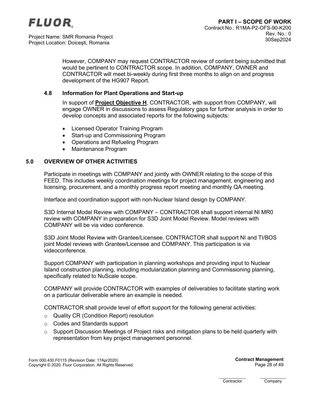Project Name: SMR Romania Project Project Location: , Romania PART I – SCOPE OF WORK Contract No.: R1MA-P2-OFS-90-K200 Rev. No.: 0 30Sep2024 Form 000.430.F0115 (Revision Date: 17Apr2020) Copyright © 2020, Fluor Corporation. All Rights Reserved. Contract Management Page 28 of 49 Contractor Company However, COMPANY may request CONTRACTOR review of content being submitted that would be pertinent to CONTRACTOR scope. In addition, COMPANY, OWNER and CONTRACTOR will meet bi-weekly during first three months to align on and progress development of the HG907 Report. 4.8 Information for Plant Operations and Start-up In support of Project Objective H, CONTRACTOR, with support from COMPANY, will engage OWNER in discussions to assess Regulatory gaps for further analysis in order to develop concepts and associated reports for the following subjects: Licensed Operator Training Program Start-up and Commissioning Program Operations and Refueling Program Maintenance Program 5.0 OVERVIEW OF OTHER ACTIVITIES Participate in meetings with COMPANY and jointly with OWNER relating to the scope of this FEED. This includes weekly coordination meetings for project management, engineering and licensing, procurement, and a monthly progress report meeting and monthly QA meeting. Interface and coordination support with non-Nuclear Island design by COMPANY. S3D Internal Model Review with COMPANY – CONTRACTOR shall support internal NI MR0 review with COMPANY in preparation for S3D Joint Model Review. Model reviews with COMPANY will be via video conference. S3D Joint Model Review with Grantee/Licensee. CONTRACTOR shall support NI and TI/BOS joint Model reviews with Grantee/Licensee and COMPANY. This participation is via videoconference. Support COMPANY with participation in planning workshops and providing input to Nuclear Island construction planning, including modularization planning and Commissioning planning, specifically related to NuScale scope. COMPANY will provide CONTRACTOR with examples of deliverables to facilitate starting work on a particular deliverable where an example is needed. CONTRACTOR shall provide level of effort support for the following general activities: o Quality CR (Condition Report) resolution o Codes and Standards support o Support Discussion Meetings of Project risks and mitigation plans to be held quarterly with representation from key project management personnel.