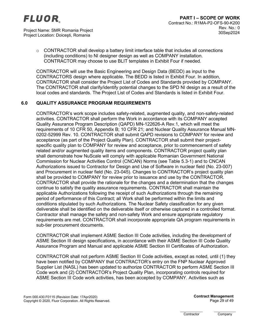 Project Name: SMR Romania Project Project Location: , Romania PART I – SCOPE OF WORK Contract No.: R1MA-P2-OFS-90-K200 Rev. No.: 0 30Sep2024 Form 000.430.F0115 (Revision Date: 17Apr2020) Copyright © 2020, Fluor Corporation. All Rights Reserved. Contract Management Page 29 of 49 Contractor Company o CONTRACTOR shall develop a battery limit interface table that includes all connections (including conditions) to NI designer design as well as COMPANY installation. CONTRACTOR may choose to use BLIT templates in Exhibit Four if needed. CONTRACTOR will use the Basic Engineering and Design Data (BEDD) as input to the CONTRACTORS design where applicable. The BEDD is listed in Exhibit Four. In addition, CONTRACTOR shall consider the Project List of Codes and Standards provided by COMPANY. The CONTRACTOR shall clarify/identify potential changes to the SPD NI design as a result of the local codes and standards. The Project List of Codes and Standards is listed in Exhibit Four. 6.0 QUALITY ASSURANCE PROGRAM REQUIREMENTS CONTRACTOR’s work scope includes safety-related, augmented quality, and non-safety-related activities. CONTRACTOR shall perform the Work in accordance with its COMPANY accepted Quality Assurance Program Description (QAPD) MN-122626-A Rev.1, which will meet the requirements of 10 CFR 50, Appendix B; 10 CFR 21; and Nuclear Quality Assurance Manual MN- 0202-52999 Rev. 10. CONTRACTOR shall submit QAPD revisions to COMPANY for review and acceptance (as part of the Project Quality Plan). CONTRACTOR shall submit their project- specific quality plan to COMPANY for review and acceptance, prior to commencement of safety related and/or augmented quality items and components. CONTRACTOR project quality plan shall demonstrate how NuScale will comply with applicable Romanian Government National Commission for Nuclear Activities Control (CNCAN) Norms (see Table 5.3-1) and to CNCAN Authorizations issued to Contractor for Design and Use of Software in nuclear field (No. 23-007) and Procurement in nuclear field (No. 23-045). Changes to CONTRACTOR’s project quality plan shall be provided to COMPANY for review prior to issuance and use by the CONTRACTOR. CONTRACTOR shall provide the rationale for the changes and a determination that the changes continue to satisfy the quality assurance requirements. CONTRACTOR shall maintain the applicable Authorizations following the receipt of such Authorizations through the remaining period of performance of this Contract; all Work shall be performed within the limits and conditions stipulated by such Authorizations. The Nuclear Safety classification for any given deliverable shall be identified on the deliverable itself or otherwise captured in a controlled format. Contractor shall manage the safety and non-safety Work and ensure appropriate regulatory requirements are met. CONTRACTOR shall incorporate appropriate QA program requirements in sub-tier procurement documents. CONTRACTOR shall implement ASME Section III Code activities, including the development of ASME Section III design specifications, in accordance with their ASME Section III Code Quality Assurance Program and Manual and applicable ASME Section III Certificates of Authorization. CONTRACTOR shall not perform ASME Section III Code activities, except as noted, until (1) they have been notified by COMPANY that CONTRACTOR’s entry on the FNP Nuclear Approved Supplier List (NASL) has been updated to authorize CONTRACTOR to perform ASME Section III Code work and (2) CONTRACTOR’s Project Quality Plan, incorporating controls required for ASME Section III Code work activities, has been accepted by COMPANY. Activities such as