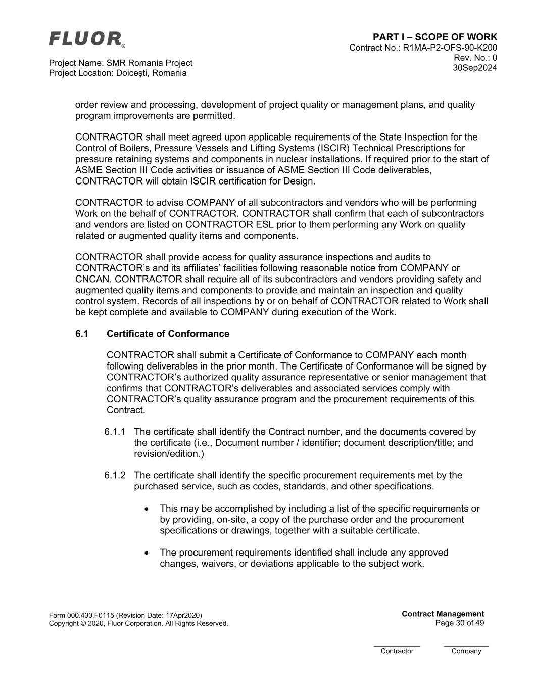 Project Name: SMR Romania Project Project Location: , Romania PART I – SCOPE OF WORK Contract No.: R1MA-P2-OFS-90-K200 Rev. No.: 0 30Sep2024 Form 000.430.F0115 (Revision Date: 17Apr2020) Copyright © 2020, Fluor Corporation. All Rights Reserved. Contract Management Page 30 of 49 Contractor Company order review and processing, development of project quality or management plans, and quality program improvements are permitted. CONTRACTOR shall meet agreed upon applicable requirements of the State Inspection for the Control of Boilers, Pressure Vessels and Lifting Systems (ISCIR) Technical Prescriptions for pressure retaining systems and components in nuclear installations. If required prior to the start of ASME Section III Code activities or issuance of ASME Section III Code deliverables, CONTRACTOR will obtain ISCIR certification for Design. CONTRACTOR to advise COMPANY of all subcontractors and vendors who will be performing Work on the behalf of CONTRACTOR. CONTRACTOR shall confirm that each of subcontractors and vendors are listed on CONTRACTOR ESL prior to them performing any Work on quality related or augmented quality items and components. CONTRACTOR shall provide access for quality assurance inspections and audits to CONTRACTOR’s and its affiliates’ facilities following reasonable notice from COMPANY or CNCAN. CONTRACTOR shall require all of its subcontractors and vendors providing safety and augmented quality items and components to provide and maintain an inspection and quality control system. Records of all inspections by or on behalf of CONTRACTOR related to Work shall be kept complete and available to COMPANY during execution of the Work. 6.1 Certificate of Conformance CONTRACTOR shall submit a Certificate of Conformance to COMPANY each month following deliverables in the prior month. The Certificate of Conformance will be signed by CONTRACTOR’s authorized quality assurance representative or senior management that confirms that CONTRACTOR’s deliverables and associated services comply with CONTRACTOR’s quality assurance program and the procurement requirements of this Contract. 6.1.1 The certificate shall identify the Contract number, and the documents covered by the certificate (i.e., Document number / identifier; document description/title; and revision/edition.) 6.1.2 The certificate shall identify the specific procurement requirements met by the purchased service, such as codes, standards, and other specifications. This may be accomplished by including a list of the specific requirements or by providing, on-site, a copy of the purchase order and the procurement specifications or drawings, together with a suitable certificate. The procurement requirements identified shall include any approved changes, waivers, or deviations applicable to the subject work.