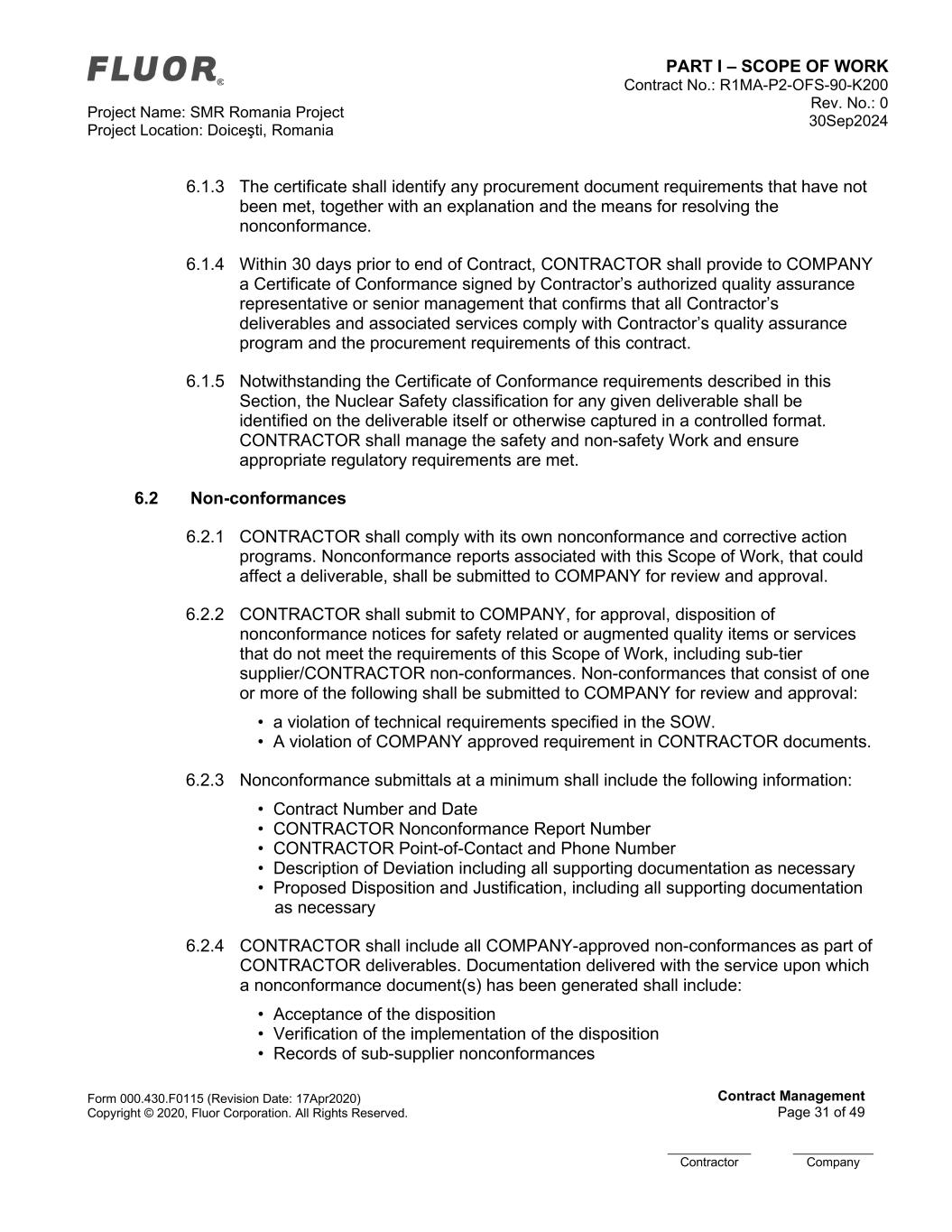 Project Name: SMR Romania Project Project Location: , Romania PART I – SCOPE OF WORK Contract No.: R1MA-P2-OFS-90-K200 Rev. No.: 0 30Sep2024 Form 000.430.F0115 (Revision Date: 17Apr2020) Copyright © 2020, Fluor Corporation. All Rights Reserved. Contract Management Page 31 of 49 Contractor Company 6.1.3 The certificate shall identify any procurement document requirements that have not been met, together with an explanation and the means for resolving the nonconformance. 6.1.4 Within 30 days prior to end of Contract, CONTRACTOR shall provide to COMPANY a Certificate of Conformance signed by Contractor’s authorized quality assurance representative or senior management that confirms that all Contractor’s deliverables and associated services comply with Contractor’s quality assurance program and the procurement requirements of this contract. 6.1.5 Notwithstanding the Certificate of Conformance requirements described in this Section, the Nuclear Safety classification for any given deliverable shall be identified on the deliverable itself or otherwise captured in a controlled format. CONTRACTOR shall manage the safety and non-safety Work and ensure appropriate regulatory requirements are met. 6.2 Non-conformances 6.2.1 CONTRACTOR shall comply with its own nonconformance and corrective action programs. Nonconformance reports associated with this Scope of Work, that could affect a deliverable, shall be submitted to COMPANY for review and approval. 6.2.2 CONTRACTOR shall submit to COMPANY, for approval, disposition of nonconformance notices for safety related or augmented quality items or services that do not meet the requirements of this Scope of Work, including sub-tier supplier/CONTRACTOR non-conformances. Non-conformances that consist of one or more of the following shall be submitted to COMPANY for review and approval: • a violation of technical requirements specified in the SOW. • A violation of COMPANY approved requirement in CONTRACTOR documents. 6.2.3 Nonconformance submittals at a minimum shall include the following information: • Contract Number and Date • CONTRACTOR Nonconformance Report Number • CONTRACTOR Point-of-Contact and Phone Number • Description of Deviation including all supporting documentation as necessary • Proposed Disposition and Justification, including all supporting documentation as necessary 6.2.4 CONTRACTOR shall include all COMPANY-approved non-conformances as part of CONTRACTOR deliverables. Documentation delivered with the service upon which a nonconformance document(s) has been generated shall include: • Acceptance of the disposition • Verification of the implementation of the disposition • Records of sub-supplier nonconformances