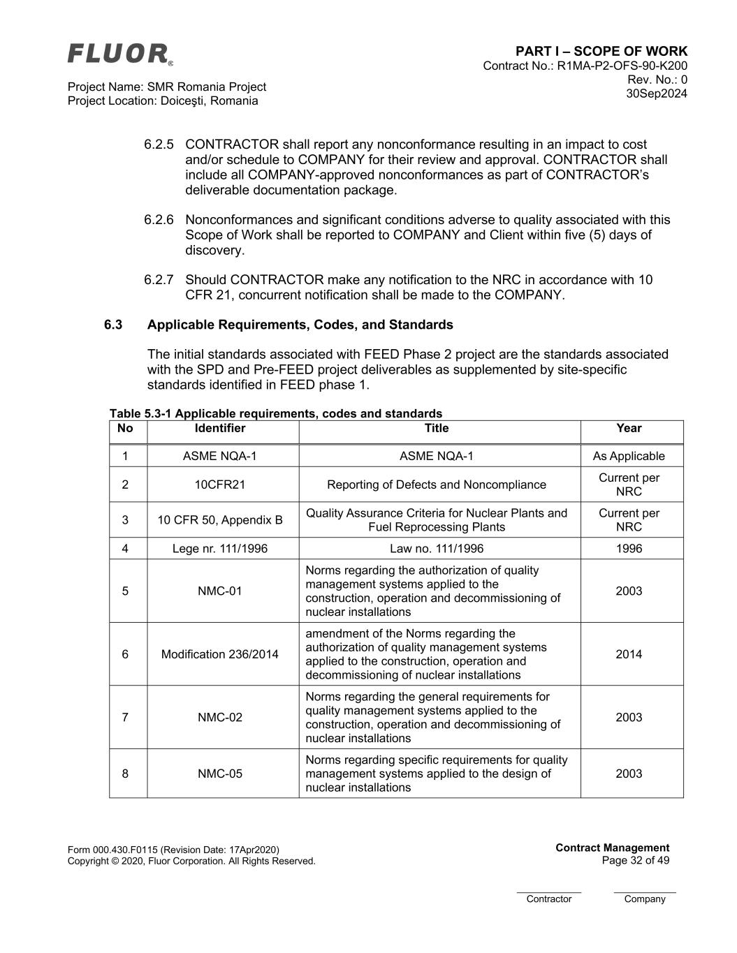Project Name: SMR Romania Project Project Location: , Romania PART I – SCOPE OF WORK Contract No.: R1MA-P2-OFS-90-K200 Rev. No.: 0 30Sep2024 Form 000.430.F0115 (Revision Date: 17Apr2020) Copyright © 2020, Fluor Corporation. All Rights Reserved. Contract Management Page 32 of 49 Contractor Company 6.2.5 CONTRACTOR shall report any nonconformance resulting in an impact to cost and/or schedule to COMPANY for their review and approval. CONTRACTOR shall include all COMPANY-approved nonconformances as part of CONTRACTOR’s deliverable documentation package. 6.2.6 Nonconformances and significant conditions adverse to quality associated with this Scope of Work shall be reported to COMPANY and Client within five (5) days of discovery. 6.2.7 Should CONTRACTOR make any notification to the NRC in accordance with 10 CFR 21, concurrent notification shall be made to the COMPANY. 6.3 Applicable Requirements, Codes, and Standards The initial standards associated with FEED Phase 2 project are the standards associated with the SPD and Pre-FEED project deliverables as supplemented by site-specific standards identified in FEED phase 1. Table 5.3-1 Applicable requirements, codes and standards No Identifier Title Year 1 ASME NQA-1 ASME NQA-1 As Applicable 2 10CFR21 Reporting of Defects and Noncompliance Current per NRC 3 10 CFR 50, Appendix B Quality Assurance Criteria for Nuclear Plants and Fuel Reprocessing Plants Current per NRC 4 Lege nr. 111/1996 Law no. 111/1996 1996 5 NMC-01 Norms regarding the authorization of quality management systems applied to the construction, operation and decommissioning of nuclear installations 2003 6 Modification 236/2014 amendment of the Norms regarding the authorization of quality management systems applied to the construction, operation and decommissioning of nuclear installations 2014 7 NMC-02 Norms regarding the general requirements for quality management systems applied to the construction, operation and decommissioning of nuclear installations 2003 8 NMC-05 Norms regarding specific requirements for quality management systems applied to the design of nuclear installations 2003