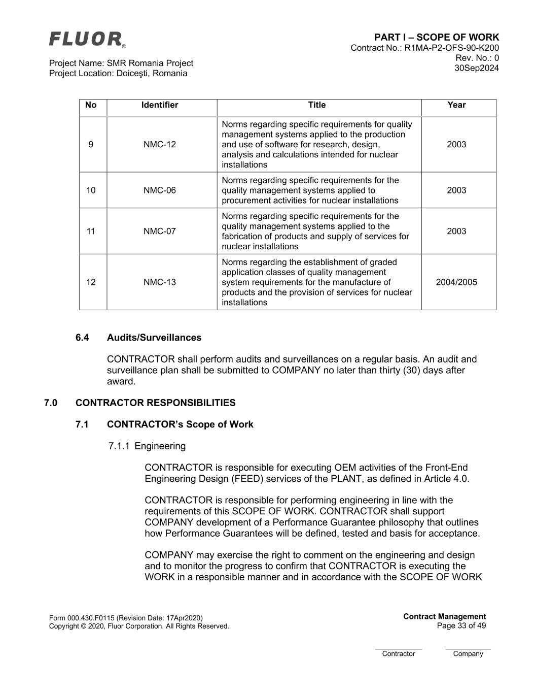 Project Name: SMR Romania Project Project Location: , Romania PART I – SCOPE OF WORK Contract No.: R1MA-P2-OFS-90-K200 Rev. No.: 0 30Sep2024 Form 000.430.F0115 (Revision Date: 17Apr2020) Copyright © 2020, Fluor Corporation. All Rights Reserved. Contract Management Page 33 of 49 Contractor Company No Identifier Title Year 9 NMC-12 Norms regarding specific requirements for quality management systems applied to the production and use of software for research, design, analysis and calculations intended for nuclear installations 2003 10 NMC-06 Norms regarding specific requirements for the quality management systems applied to procurement activities for nuclear installations 2003 11 NMC-07 Norms regarding specific requirements for the quality management systems applied to the fabrication of products and supply of services for nuclear installations 2003 12 NMC-13 Norms regarding the establishment of graded application classes of quality management system requirements for the manufacture of products and the provision of services for nuclear installations 2004/2005 6.4 Audits/Surveillances CONTRACTOR shall perform audits and surveillances on a regular basis. An audit and surveillance plan shall be submitted to COMPANY no later than thirty (30) days after award. 7.0 CONTRACTOR RESPONSIBILITIES 7.1 CONTRACTOR’s Scope of Work 7.1.1 Engineering CONTRACTOR is responsible for executing OEM activities of the Front-End Engineering Design (FEED) services of the PLANT, as defined in Article 4.0. CONTRACTOR is responsible for performing engineering in line with the requirements of this SCOPE OF WORK. CONTRACTOR shall support COMPANY development of a Performance Guarantee philosophy that outlines how Performance Guarantees will be defined, tested and basis for acceptance. COMPANY may exercise the right to comment on the engineering and design and to monitor the progress to confirm that CONTRACTOR is executing the WORK in a responsible manner and in accordance with the SCOPE OF WORK