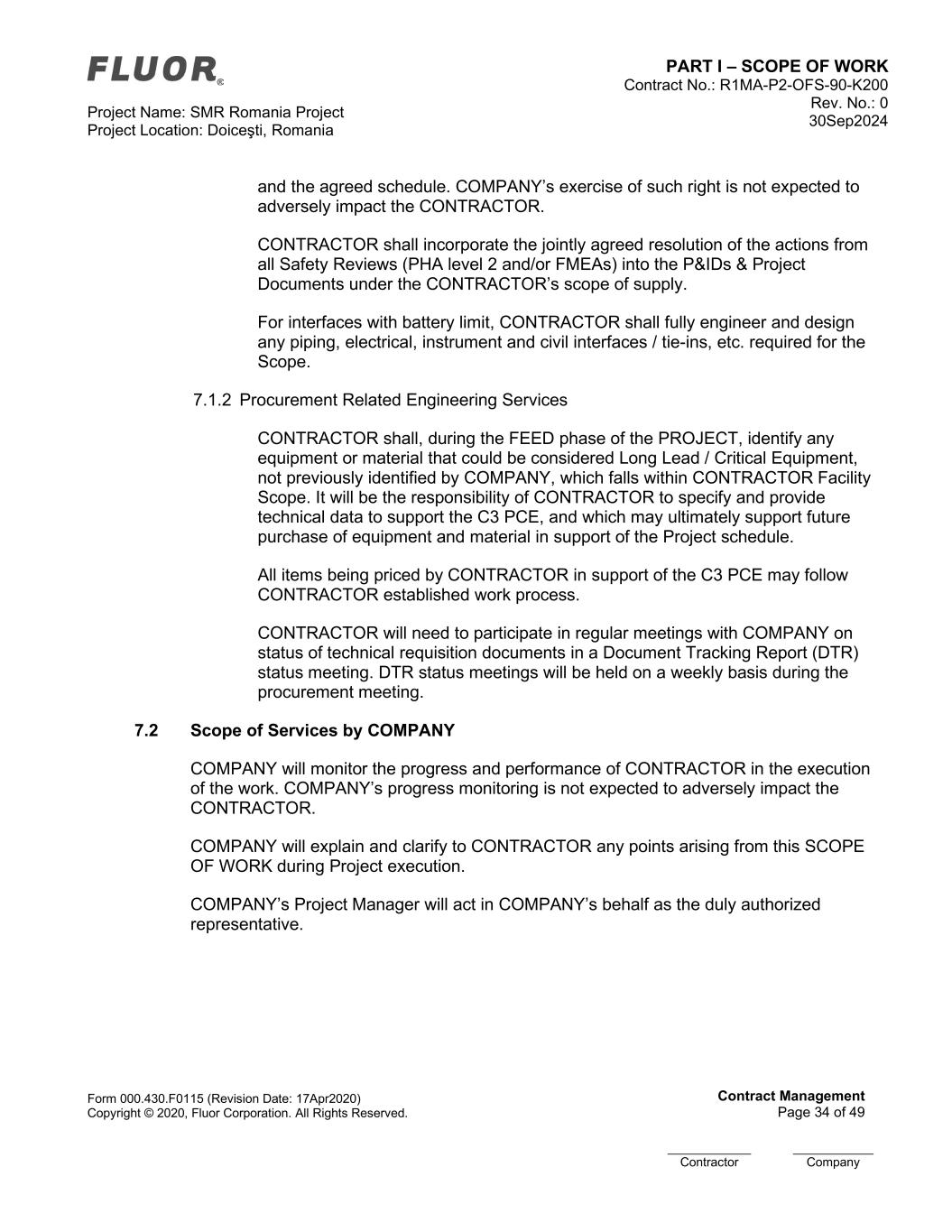 Project Name: SMR Romania Project Project Location: , Romania PART I – SCOPE OF WORK Contract No.: R1MA-P2-OFS-90-K200 Rev. No.: 0 30Sep2024 Form 000.430.F0115 (Revision Date: 17Apr2020) Copyright © 2020, Fluor Corporation. All Rights Reserved. Contract Management Page 34 of 49 Contractor Company and the agreed schedule. COMPANY’s exercise of such right is not expected to adversely impact the CONTRACTOR. CONTRACTOR shall incorporate the jointly agreed resolution of the actions from all Safety Reviews (PHA level 2 and/or FMEAs) into the P&IDs & Project Documents under the CONTRACTOR’s scope of supply. For interfaces with battery limit, CONTRACTOR shall fully engineer and design any piping, electrical, instrument and civil interfaces / tie-ins, etc. required for the Scope. 7.1.2 Procurement Related Engineering Services CONTRACTOR shall, during the FEED phase of the PROJECT, identify any equipment or material that could be considered Long Lead / Critical Equipment, not previously identified by COMPANY, which falls within CONTRACTOR Facility Scope. It will be the responsibility of CONTRACTOR to specify and provide technical data to support the C3 PCE, and which may ultimately support future purchase of equipment and material in support of the Project schedule. All items being priced by CONTRACTOR in support of the C3 PCE may follow CONTRACTOR established work process. CONTRACTOR will need to participate in regular meetings with COMPANY on status of technical requisition documents in a Document Tracking Report (DTR) status meeting. DTR status meetings will be held on a weekly basis during the procurement meeting. 7.2 Scope of Services by COMPANY COMPANY will monitor the progress and performance of CONTRACTOR in the execution of the work. COMPANY’s progress monitoring is not expected to adversely impact the CONTRACTOR. COMPANY will explain and clarify to CONTRACTOR any points arising from this SCOPE OF WORK during Project execution. COMPANY’s Project Manager will act in COMPANY’s behalf as the duly authorized representative.