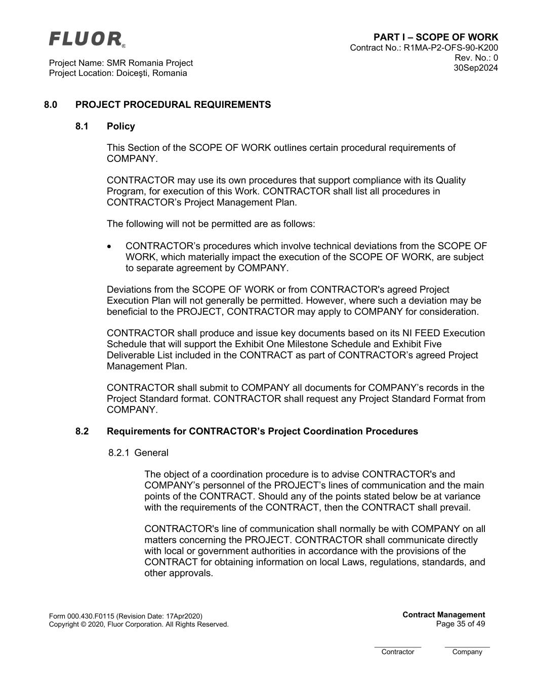 Project Name: SMR Romania Project Project Location: , Romania PART I – SCOPE OF WORK Contract No.: R1MA-P2-OFS-90-K200 Rev. No.: 0 30Sep2024 Form 000.430.F0115 (Revision Date: 17Apr2020) Copyright © 2020, Fluor Corporation. All Rights Reserved. Contract Management Page 35 of 49 Contractor Company 8.0 PROJECT PROCEDURAL REQUIREMENTS 8.1 Policy This Section of the SCOPE OF WORK outlines certain procedural requirements of COMPANY. CONTRACTOR may use its own procedures that support compliance with its Quality Program, for execution of this Work. CONTRACTOR shall list all procedures in CONTRACTOR’s Project Management Plan. The following will not be permitted are as follows: CONTRACTOR’s procedures which involve technical deviations from the SCOPE OF WORK, which materially impact the execution of the SCOPE OF WORK, are subject to separate agreement by COMPANY. Deviations from the SCOPE OF WORK or from CONTRACTOR's agreed Project Execution Plan will not generally be permitted. However, where such a deviation may be beneficial to the PROJECT, CONTRACTOR may apply to COMPANY for consideration. CONTRACTOR shall produce and issue key documents based on its NI FEED Execution Schedule that will support the Exhibit One Milestone Schedule and Exhibit Five Deliverable List included in the CONTRACT as part of CONTRACTOR’s agreed Project Management Plan. CONTRACTOR shall submit to COMPANY all documents for COMPANY’s records in the Project Standard format. CONTRACTOR shall request any Project Standard Format from COMPANY. 8.2 Requirements for CONTRACTOR’s Project Coordination Procedures 8.2.1 General The object of a coordination procedure is to advise CONTRACTOR's and COMPANY’s personnel of the PROJECT’s lines of communication and the main points of the CONTRACT. Should any of the points stated below be at variance with the requirements of the CONTRACT, then the CONTRACT shall prevail. CONTRACTOR's line of communication shall normally be with COMPANY on all matters concerning the PROJECT. CONTRACTOR shall communicate directly with local or government authorities in accordance with the provisions of the CONTRACT for obtaining information on local Laws, regulations, standards, and other approvals.