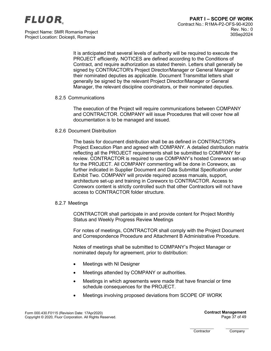 Project Name: SMR Romania Project Project Location: , Romania PART I – SCOPE OF WORK Contract No.: R1MA-P2-OFS-90-K200 Rev. No.: 0 30Sep2024 Form 000.430.F0115 (Revision Date: 17Apr2020) Copyright © 2020, Fluor Corporation. All Rights Reserved. Contract Management Page 37 of 49 Contractor Company It is anticipated that several levels of authority will be required to execute the PROJECT efficiently. NOTICES are defined according to the Conditions of Contract, and require authorization as stated therein. Letters shall generally be signed by CONTRACTOR's Project Director/Manager or General Manager or their nominated deputies as applicable. Document Transmittal letters shall generally be signed by the relevant Project Director/Manager or General Manager, the relevant discipline coordinators, or their nominated deputies. 8.2.5 Communications The execution of the Project will require communications between COMPANY and CONTRACTOR. COMPANY will issue Procedures that will cover how all documentation is to be managed and issued. 8.2.6 Document Distribution The basis for document distribution shall be as defined in CONTRACTOR's Project Execution Plan and agreed with COMPANY. A detailed distribution matrix reflecting all the PROJECT requirements shall be submitted to COMPANY for review. CONTRACTOR is required to use COMPANY’s hosted Coreworx set-up for the PROJECT. All COMPANY commenting will be done in Coreworx, as further indicated in Supplier Document and Data Submittal Specification under Exhibit Two. COMPANY will provide required access manuals, support, architecture set-up and training in Coreworx to CONTRACTOR. Access to Coreworx content is strictly controlled such that other Contractors will not have access to CONTRACTOR folder structure. 8.2.7 Meetings CONTRACTOR shall participate in and provide content for Project Monthly Status and Weekly Progress Review Meetings For notes of meetings, CONTRACTOR shall comply with the Project Document and Correspondence Procedure and Attachment B Administrative Procedure. Notes of meetings shall be submitted to COMPANY’s Project Manager or nominated deputy for agreement, prior to distribution: Meetings with NI Designer Meetings attended by COMPANY or authorities. Meetings in which agreements were made that have financial or time schedule consequences for the PROJECT. Meetings involving proposed deviations from SCOPE OF WORK