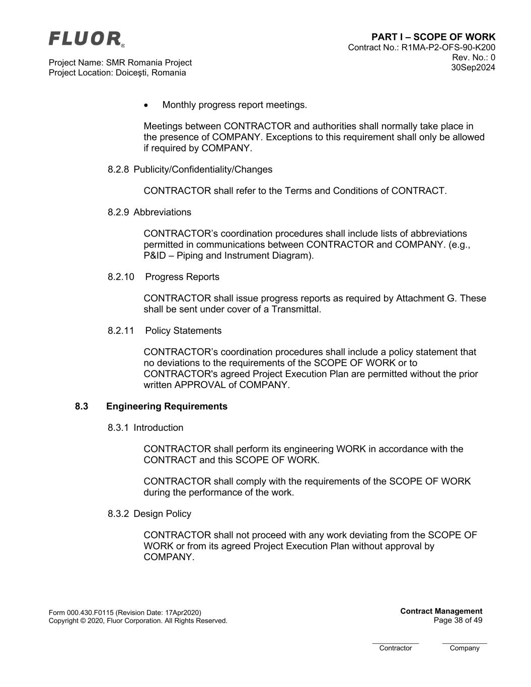 Project Name: SMR Romania Project Project Location: , Romania PART I – SCOPE OF WORK Contract No.: R1MA-P2-OFS-90-K200 Rev. No.: 0 30Sep2024 Form 000.430.F0115 (Revision Date: 17Apr2020) Copyright © 2020, Fluor Corporation. All Rights Reserved. Contract Management Page 38 of 49 Contractor Company Monthly progress report meetings. Meetings between CONTRACTOR and authorities shall normally take place in the presence of COMPANY. Exceptions to this requirement shall only be allowed if required by COMPANY. 8.2.8 Publicity/Confidentiality/Changes CONTRACTOR shall refer to the Terms and Conditions of CONTRACT. 8.2.9 Abbreviations CONTRACTOR’s coordination procedures shall include lists of abbreviations permitted in communications between CONTRACTOR and COMPANY. (e.g., P&ID – Piping and Instrument Diagram). 8.2.10 Progress Reports CONTRACTOR shall issue progress reports as required by Attachment G. These shall be sent under cover of a Transmittal. 8.2.11 Policy Statements CONTRACTOR’s coordination procedures shall include a policy statement that no deviations to the requirements of the SCOPE OF WORK or to CONTRACTOR's agreed Project Execution Plan are permitted without the prior written APPROVAL of COMPANY. 8.3 Engineering Requirements 8.3.1 Introduction CONTRACTOR shall perform its engineering WORK in accordance with the CONTRACT and this SCOPE OF WORK. CONTRACTOR shall comply with the requirements of the SCOPE OF WORK during the performance of the work. 8.3.2 Design Policy CONTRACTOR shall not proceed with any work deviating from the SCOPE OF WORK or from its agreed Project Execution Plan without approval by COMPANY.