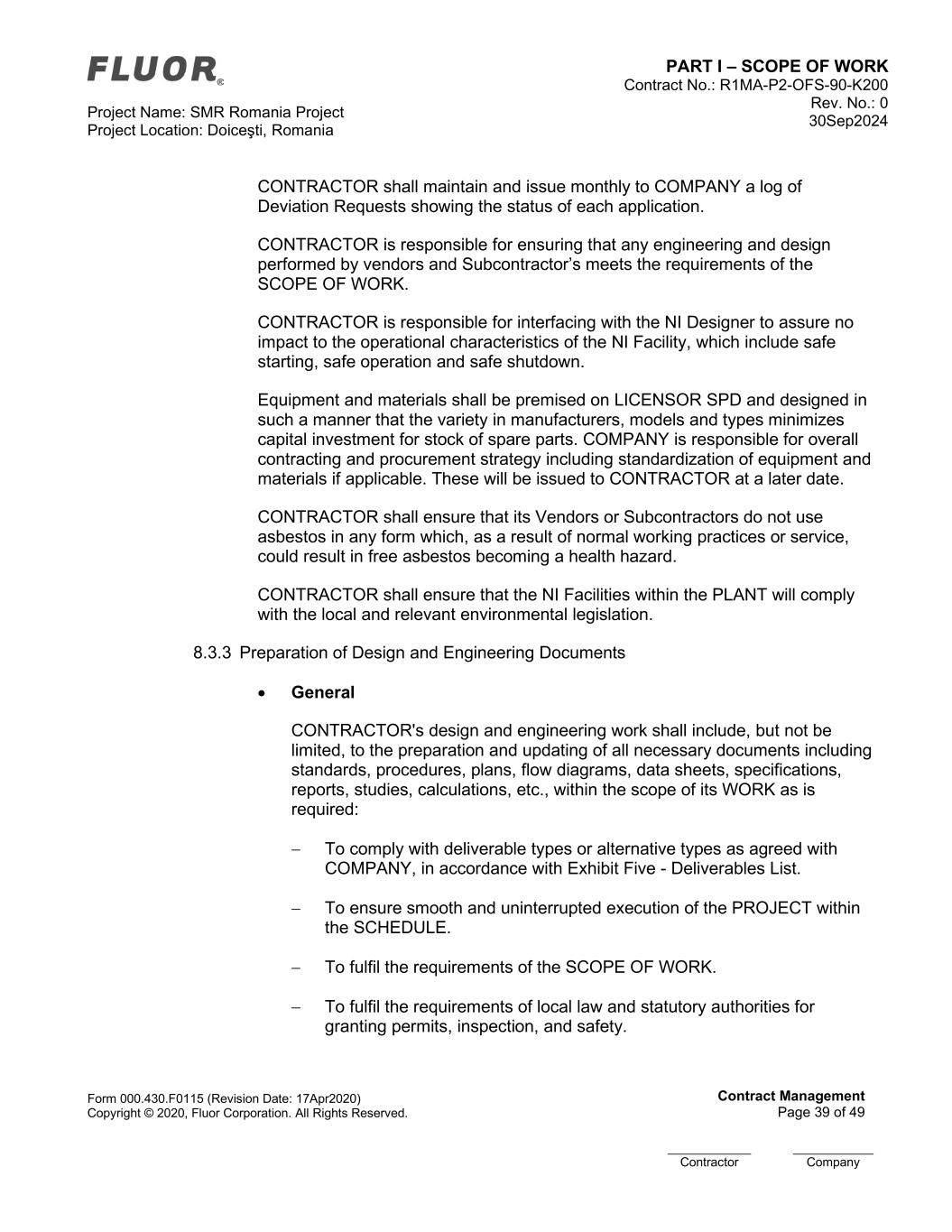 Project Name: SMR Romania Project Project Location: , Romania PART I – SCOPE OF WORK Contract No.: R1MA-P2-OFS-90-K200 Rev. No.: 0 30Sep2024 Form 000.430.F0115 (Revision Date: 17Apr2020) Copyright © 2020, Fluor Corporation. All Rights Reserved. Contract Management Page 39 of 49 Contractor Company CONTRACTOR shall maintain and issue monthly to COMPANY a log of Deviation Requests showing the status of each application. CONTRACTOR is responsible for ensuring that any engineering and design performed by vendors and Subcontractor’s meets the requirements of the SCOPE OF WORK. CONTRACTOR is responsible for interfacing with the NI Designer to assure no impact to the operational characteristics of the NI Facility, which include safe starting, safe operation and safe shutdown. Equipment and materials shall be premised on LICENSOR SPD and designed in such a manner that the variety in manufacturers, models and types minimizes capital investment for stock of spare parts. COMPANY is responsible for overall contracting and procurement strategy including standardization of equipment and materials if applicable. These will be issued to CONTRACTOR at a later date. CONTRACTOR shall ensure that its Vendors or Subcontractors do not use asbestos in any form which, as a result of normal working practices or service, could result in free asbestos becoming a health hazard. CONTRACTOR shall ensure that the NI Facilities within the PLANT will comply with the local and relevant environmental legislation. 8.3.3 Preparation of Design and Engineering Documents General CONTRACTOR's design and engineering work shall include, but not be limited, to the preparation and updating of all necessary documents including standards, procedures, plans, flow diagrams, data sheets, specifications, reports, studies, calculations, etc., within the scope of its WORK as is required: To comply with deliverable types or alternative types as agreed with COMPANY, in accordance with Exhibit Five - Deliverables List. To ensure smooth and uninterrupted execution of the PROJECT within the SCHEDULE. To fulfil the requirements of the SCOPE OF WORK. To fulfil the requirements of local law and statutory authorities for granting permits, inspection, and safety.