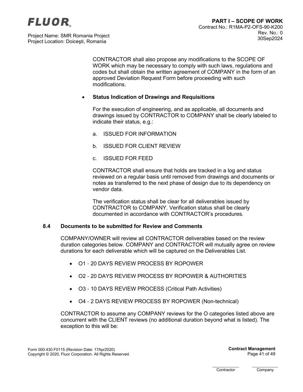 Project Name: SMR Romania Project Project Location: , Romania PART I – SCOPE OF WORK Contract No.: R1MA-P2-OFS-90-K200 Rev. No.: 0 30Sep2024 Form 000.430.F0115 (Revision Date: 17Apr2020) Copyright © 2020, Fluor Corporation. All Rights Reserved. Contract Management Page 41 of 49 Contractor Company CONTRACTOR shall also propose any modifications to the SCOPE OF WORK which may be necessary to comply with such laws, regulations and codes but shall obtain the written agreement of COMPANY in the form of an approved Deviation Request Form before proceeding with such modifications. Status Indication of Drawings and Requisitions For the execution of engineering, and as applicable, all documents and drawings issued by CONTRACTOR to COMPANY shall be clearly labeled to indicate their status, e.g.: a. ISSUED FOR INFORMATION b. ISSUED FOR CLIENT REVIEW c. ISSUED FOR FEED CONTRACTOR shall ensure that holds are tracked in a log and status reviewed on a regular basis until removed from drawings and documents or notes as transferred to the next phase of design due to its dependency on vendor data. The verification status shall be clear for all deliverables issued by CONTRACTOR to COMPANY. Verification status shall be clearly documented in accordance with CONTRACTOR’s procedures. 8.4 Documents to be submitted for Review and Comments COMPANY/OWNER will review all CONTRACTOR deliverables based on the review duration categories below. COMPANY and CONTRACTOR will mutually agree on review durations for each deliverable which will be captured on the Deliverables List. O1 - 20 DAYS REVIEW PROCESS BY ROPOWER O2 - 20 DAYS REVIEW PROCESS BY ROPOWER & AUTHORITIES O3 - 10 DAYS REVIEW PROCESS (Critical Path Activities) O4 - 2 DAYS REVIEW PROCESS BY ROPOWER (Non-technical) CONTRACTOR to assume any COMPANY reviews for the O categories listed above are concurrent with the CLIENT reviews (no additional duration beyond what is listed). The exception to this will be: