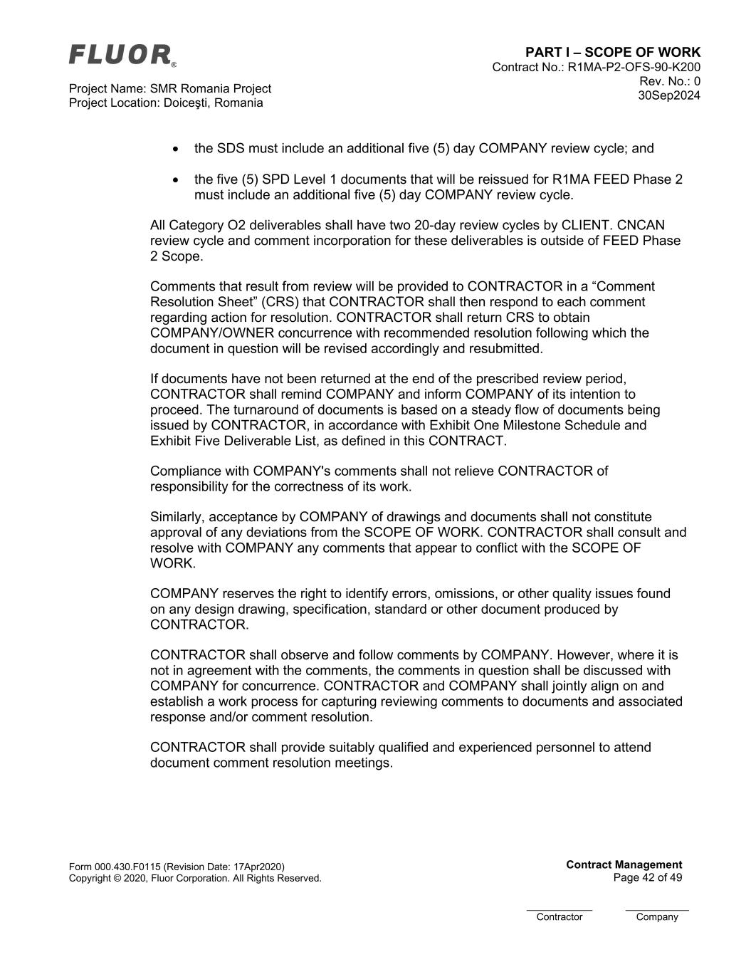 Project Name: SMR Romania Project Project Location: , Romania PART I – SCOPE OF WORK Contract No.: R1MA-P2-OFS-90-K200 Rev. No.: 0 30Sep2024 Form 000.430.F0115 (Revision Date: 17Apr2020) Copyright © 2020, Fluor Corporation. All Rights Reserved. Contract Management Page 42 of 49 Contractor Company the SDS must include an additional five (5) day COMPANY review cycle; and the five (5) SPD Level 1 documents that will be reissued for R1MA FEED Phase 2 must include an additional five (5) day COMPANY review cycle. All Category O2 deliverables shall have two 20-day review cycles by CLIENT. CNCAN review cycle and comment incorporation for these deliverables is outside of FEED Phase 2 Scope. Comments that result from review will be provided to CONTRACTOR in a “Comment Resolution Sheet” (CRS) that CONTRACTOR shall then respond to each comment regarding action for resolution. CONTRACTOR shall return CRS to obtain COMPANY/OWNER concurrence with recommended resolution following which the document in question will be revised accordingly and resubmitted. If documents have not been returned at the end of the prescribed review period, CONTRACTOR shall remind COMPANY and inform COMPANY of its intention to proceed. The turnaround of documents is based on a steady flow of documents being issued by CONTRACTOR, in accordance with Exhibit One Milestone Schedule and Exhibit Five Deliverable List, as defined in this CONTRACT. Compliance with COMPANY's comments shall not relieve CONTRACTOR of responsibility for the correctness of its work. Similarly, acceptance by COMPANY of drawings and documents shall not constitute approval of any deviations from the SCOPE OF WORK. CONTRACTOR shall consult and resolve with COMPANY any comments that appear to conflict with the SCOPE OF WORK. COMPANY reserves the right to identify errors, omissions, or other quality issues found on any design drawing, specification, standard or other document produced by CONTRACTOR. CONTRACTOR shall observe and follow comments by COMPANY. However, where it is not in agreement with the comments, the comments in question shall be discussed with COMPANY for concurrence. CONTRACTOR and COMPANY shall jointly align on and establish a work process for capturing reviewing comments to documents and associated response and/or comment resolution. CONTRACTOR shall provide suitably qualified and experienced personnel to attend document comment resolution meetings.
