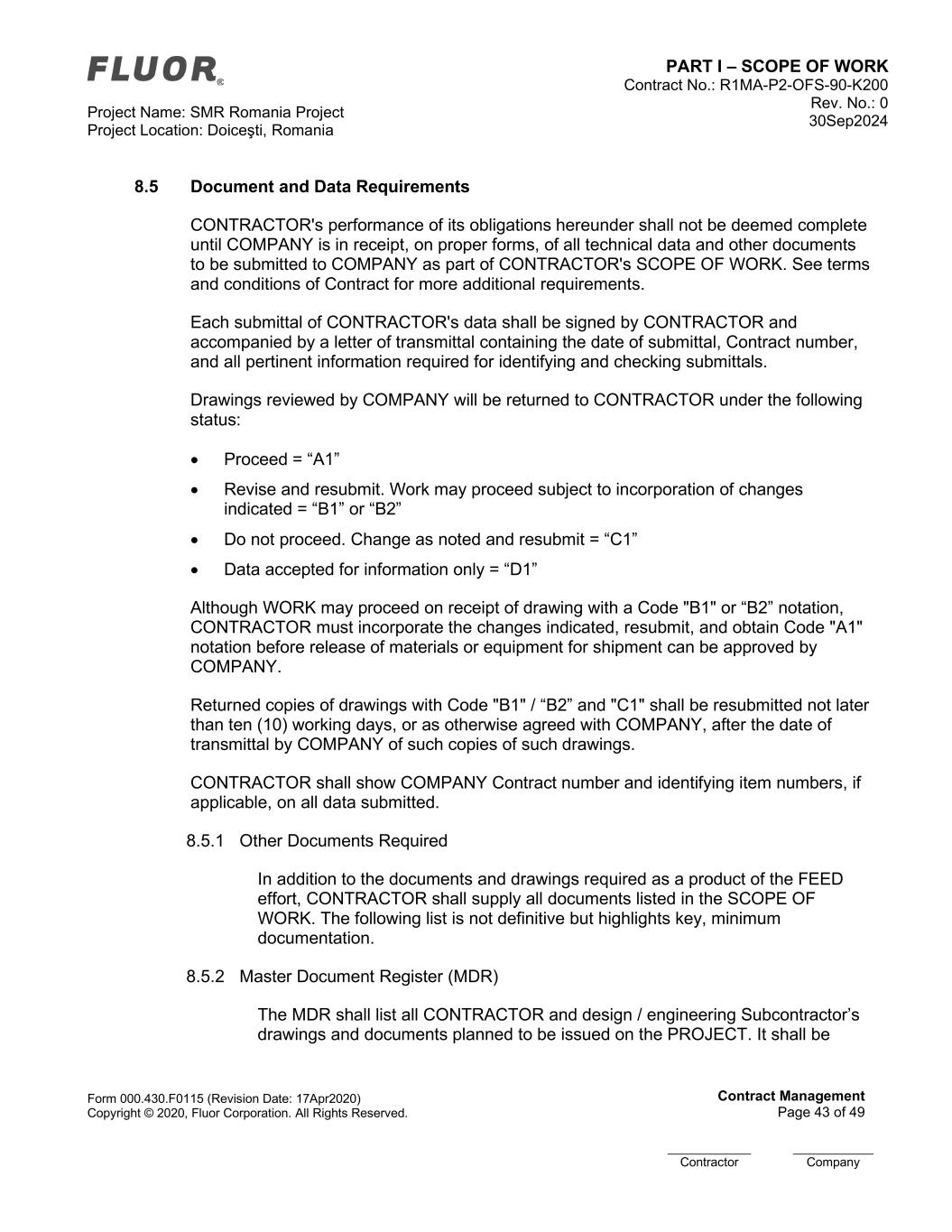 Project Name: SMR Romania Project Project Location: , Romania PART I – SCOPE OF WORK Contract No.: R1MA-P2-OFS-90-K200 Rev. No.: 0 30Sep2024 Form 000.430.F0115 (Revision Date: 17Apr2020) Copyright © 2020, Fluor Corporation. All Rights Reserved. Contract Management Page 43 of 49 Contractor Company 8.5 Document and Data Requirements CONTRACTOR's performance of its obligations hereunder shall not be deemed complete until COMPANY is in receipt, on proper forms, of all technical data and other documents to be submitted to COMPANY as part of CONTRACTOR's SCOPE OF WORK. See terms and conditions of Contract for more additional requirements. Each submittal of CONTRACTOR's data shall be signed by CONTRACTOR and accompanied by a letter of transmittal containing the date of submittal, Contract number, and all pertinent information required for identifying and checking submittals. Drawings reviewed by COMPANY will be returned to CONTRACTOR under the following status: Proceed = “A1” Revise and resubmit. Work may proceed subject to incorporation of changes indicated = “B1” or “B2” Do not proceed. Change as noted and resubmit = “C1” Data accepted for information only = “D1” Although WORK may proceed on receipt of drawing with a Code "B1" or “B2” notation, CONTRACTOR must incorporate the changes indicated, resubmit, and obtain Code "A1" notation before release of materials or equipment for shipment can be approved by COMPANY. Returned copies of drawings with Code "B1" / “B2” and "C1" shall be resubmitted not later than ten (10) working days, or as otherwise agreed with COMPANY, after the date of transmittal by COMPANY of such copies of such drawings. CONTRACTOR shall show COMPANY Contract number and identifying item numbers, if applicable, on all data submitted. 8.5.1 Other Documents Required In addition to the documents and drawings required as a product of the FEED effort, CONTRACTOR shall supply all documents listed in the SCOPE OF WORK. The following list is not definitive but highlights key, minimum documentation. 8.5.2 Master Document Register (MDR) The MDR shall list all CONTRACTOR and design / engineering Subcontractor’s drawings and documents planned to be issued on the PROJECT. It shall be
