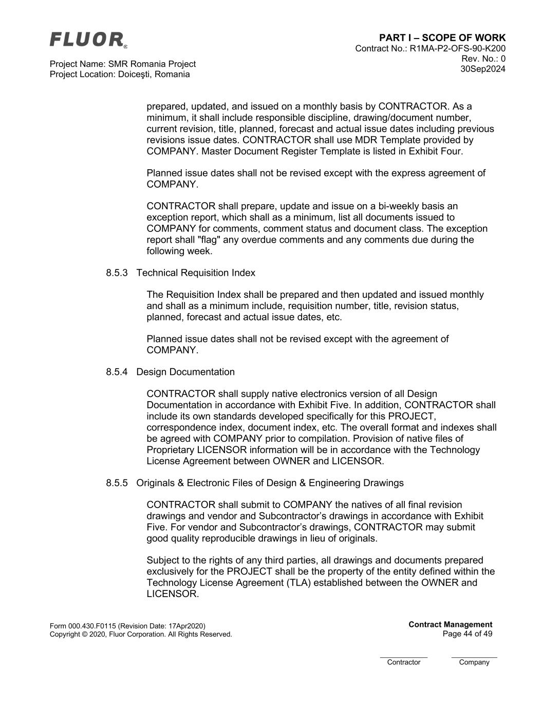 Project Name: SMR Romania Project Project Location: , Romania PART I – SCOPE OF WORK Contract No.: R1MA-P2-OFS-90-K200 Rev. No.: 0 30Sep2024 Form 000.430.F0115 (Revision Date: 17Apr2020) Copyright © 2020, Fluor Corporation. All Rights Reserved. Contract Management Page 44 of 49 Contractor Company prepared, updated, and issued on a monthly basis by CONTRACTOR. As a minimum, it shall include responsible discipline, drawing/document number, current revision, title, planned, forecast and actual issue dates including previous revisions issue dates. CONTRACTOR shall use MDR Template provided by COMPANY. Master Document Register Template is listed in Exhibit Four. Planned issue dates shall not be revised except with the express agreement of COMPANY. CONTRACTOR shall prepare, update and issue on a bi-weekly basis an exception report, which shall as a minimum, list all documents issued to COMPANY for comments, comment status and document class. The exception report shall "flag" any overdue comments and any comments due during the following week. 8.5.3 Technical Requisition Index The Requisition Index shall be prepared and then updated and issued monthly and shall as a minimum include, requisition number, title, revision status, planned, forecast and actual issue dates, etc. Planned issue dates shall not be revised except with the agreement of COMPANY. 8.5.4 Design Documentation CONTRACTOR shall supply native electronics version of all Design Documentation in accordance with Exhibit Five. In addition, CONTRACTOR shall include its own standards developed specifically for this PROJECT, correspondence index, document index, etc. The overall format and indexes shall be agreed with COMPANY prior to compilation. Provision of native files of Proprietary LICENSOR information will be in accordance with the Technology License Agreement between OWNER and LICENSOR. 8.5.5 Originals & Electronic Files of Design & Engineering Drawings CONTRACTOR shall submit to COMPANY the natives of all final revision drawings and vendor and Subcontractor’s drawings in accordance with Exhibit Five. For vendor and Subcontractor’s drawings, CONTRACTOR may submit good quality reproducible drawings in lieu of originals. Subject to the rights of any third parties, all drawings and documents prepared exclusively for the PROJECT shall be the property of the entity defined within the Technology License Agreement (TLA) established between the OWNER and LICENSOR.