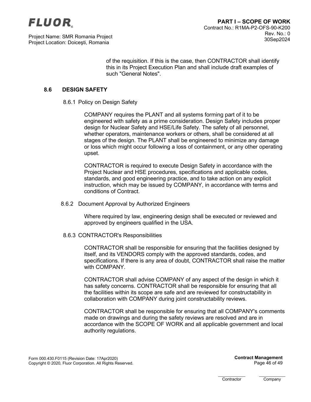 Project Name: SMR Romania Project Project Location: , Romania PART I – SCOPE OF WORK Contract No.: R1MA-P2-OFS-90-K200 Rev. No.: 0 30Sep2024 Form 000.430.F0115 (Revision Date: 17Apr2020) Copyright © 2020, Fluor Corporation. All Rights Reserved. Contract Management Page 46 of 49 Contractor Company of the requisition. If this is the case, then CONTRACTOR shall identify this in its Project Execution Plan and shall include draft examples of such "General Notes". 8.6 DESIGN SAFETY 8.6.1 Policy on Design Safety COMPANY requires the PLANT and all systems forming part of it to be engineered with safety as a prime consideration. Design Safety includes proper design for Nuclear Safety and HSE/Life Safety. The safety of all personnel, whether operators, maintenance workers or others, shall be considered at all stages of the design. The PLANT shall be engineered to minimize any damage or loss which might occur following a loss of containment, or any other operating upset. CONTRACTOR is required to execute Design Safety in accordance with the Project Nuclear and HSE procedures, specifications and applicable codes, standards, and good engineering practice, and to take action on any explicit instruction, which may be issued by COMPANY, in accordance with terms and conditions of Contract. 8.6.2 Document Approval by Authorized Engineers Where required by law, engineering design shall be executed or reviewed and approved by engineers qualified in the USA. 8.6.3 CONTRACTOR's Responsibilities CONTRACTOR shall be responsible for ensuring that the facilities designed by itself, and its VENDORS comply with the approved standards, codes, and specifications. If there is any area of doubt, CONTRACTOR shall raise the matter with COMPANY. CONTRACTOR shall advise COMPANY of any aspect of the design in which it has safety concerns. CONTRACTOR shall be responsible for ensuring that all the facilities within its scope are safe and are reviewed for constructability in collaboration with COMPANY during joint constructability reviews. CONTRACTOR shall be responsible for ensuring that all COMPANY's comments made on drawings and during the safety reviews are resolved and are in accordance with the SCOPE OF WORK and all applicable government and local authority regulations.