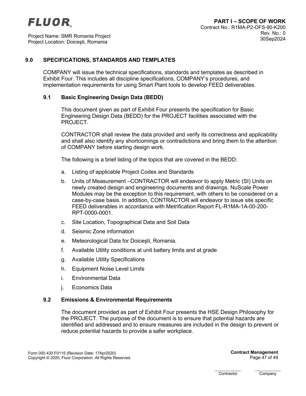 Project Name: SMR Romania Project Project Location: , Romania PART I – SCOPE OF WORK Contract No.: R1MA-P2-OFS-90-K200 Rev. No.: 0 30Sep2024 Form 000.430.F0115 (Revision Date: 17Apr2020) Copyright © 2020, Fluor Corporation. All Rights Reserved. Contract Management Page 47 of 49 Contractor Company 9.0 SPECIFICATIONS, STANDARDS AND TEMPLATES COMPANY will issue the technical specifications, standards and templates as described in Exhibit Four. This includes all discipline specifications, COMPANY’s procedures, and implementation requirements for using Smart Plant tools to develop FEED deliverables. 9.1 Basic Engineering Design Data (BEDD) This document given as part of Exhibit Four presents the specification for Basic Engineering Design Data (BEDD) for the PROJECT facilities associated with the PROJECT. CONTRACTOR shall review the data provided and verify its correctness and applicability and shall also identify any shortcomings or contradictions and bring them to the attention of COMPANY before starting design work. The following is a brief listing of the topics that are covered in the BEDD: a. Listing of applicable Project Codes and Standards b. Units of Measurement –CONTRACTOR will endeavor to apply Metric (SI) Units on newly created design and engineering documents and drawings. NuScale Power Modules may be the exception to this requirement, with others to be considered on a case-by-case basis. In addition, CONTRACTOR will endeavor to issue site specific FEED deliverables in accordance with Metrification Report FL-R1MA-1A-00-200- RPT-0000-0001. c. Site Location, Topographical Data and Soil Data d. Seismic Zone information e. Meteorological Data for , Romania. f. Available Utility conditions at unit battery limits and at grade g. Available Utility Specifications h. Equipment Noise Level Limits i. Environmental Data j. Economics Data 9.2 Emissions & Environmental Requirements The document provided as part of Exhibit Four presents the HSE Design Philosophy for the PROJECT. The purpose of the document is to ensure that potential hazards are identified and addressed and to ensure measures are included in the design to prevent or reduce potential hazards to provide a safer workplace.