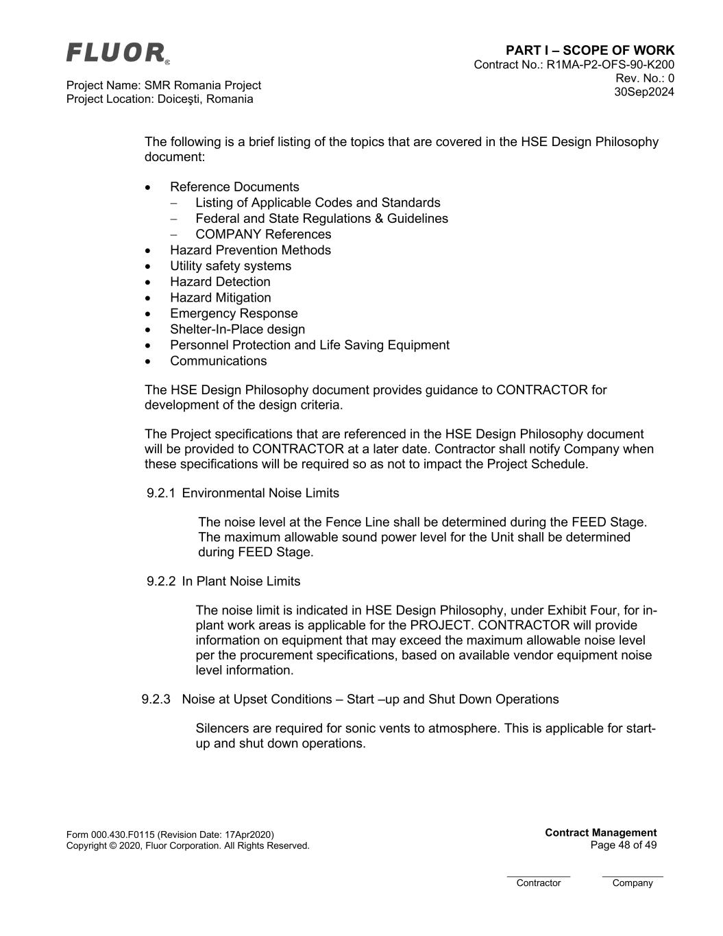 Project Name: SMR Romania Project Project Location: , Romania PART I – SCOPE OF WORK Contract No.: R1MA-P2-OFS-90-K200 Rev. No.: 0 30Sep2024 Form 000.430.F0115 (Revision Date: 17Apr2020) Copyright © 2020, Fluor Corporation. All Rights Reserved. Contract Management Page 48 of 49 Contractor Company The following is a brief listing of the topics that are covered in the HSE Design Philosophy document: Reference Documents Listing of Applicable Codes and Standards Federal and State Regulations & Guidelines COMPANY References Hazard Prevention Methods Utility safety systems Hazard Detection Hazard Mitigation Emergency Response Shelter-In-Place design Personnel Protection and Life Saving Equipment Communications The HSE Design Philosophy document provides guidance to CONTRACTOR for development of the design criteria. The Project specifications that are referenced in the HSE Design Philosophy document will be provided to CONTRACTOR at a later date. Contractor shall notify Company when these specifications will be required so as not to impact the Project Schedule. 9.2.1 Environmental Noise Limits The noise level at the Fence Line shall be determined during the FEED Stage. The maximum allowable sound power level for the Unit shall be determined during FEED Stage. 9.2.2 In Plant Noise Limits The noise limit is indicated in HSE Design Philosophy, under Exhibit Four, for in- plant work areas is applicable for the PROJECT. CONTRACTOR will provide information on equipment that may exceed the maximum allowable noise level per the procurement specifications, based on available vendor equipment noise level information. 9.2.3 Noise at Upset Conditions – Start –up and Shut Down Operations Silencers are required for sonic vents to atmosphere. This is applicable for start- up and shut down operations.