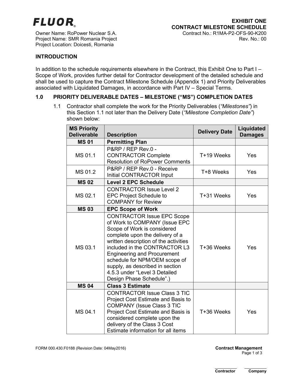 EXHIBIT ONE CONTRACT MILESTONE SCHEDULE Owner Name: RoPower Nuclear S.A. Contract No.: R1MA-P2-OFS-90-K200 Project Name: SMR Romania Project Rev. No.: 00 Project Location: Doicesti, Romania FORM 000.430.F0188 (Revision Date: 04May2016) Contract Management Page 1 of 3 __________ __________ Contractor Company INTRODUCTION In addition to the schedule requirements elsewhere in the Contract, this Exhibit One to Part I – Scope of Work, provides further detail for Contractor development of the detailed schedule and shall be used to capture the Contract Milestone Schedule (Appendix 1) and Priority Deliverables associated with Liquidated Damages, in accordance with Part IV – Special Terms. 1.0 PRIORITY DELIVERABLE DATES – MILESTONE (“MS”) COMPLETION DATES 1.1 Contractor shall complete the work for the Priority Deliverables (“Milestones”) in this Section 1.1 not later than the Delivery Date (“Milestone Completion Date”) shown below: MS Priority Deliverable Description Delivery Date Liquidated Damages MS 01 Permitting Plan MS 01.1 P&RP / REP Rev.0 - CONTRACTOR Complete Resolution of RoPower Comments T+19 Weeks Yes MS 01.2 P&RP / REP Rev.0 - Receive Initial CONTRACTOR Input T+8 Weeks Yes MS 02 Level 2 EPC Schedule MS 02.1 CONTRACTOR Issue Level 2 EPC Project Schedule to COMPANY for Review T+31 Weeks Yes MS 03 EPC Scope of Work MS 03.1 CONTRACTOR Issue EPC Scope of Work to COMPANY (Issue EPC Scope of Work is considered complete upon the delivery of a written description of the activities included in the CONTRACTOR L3 Engineering and Procurement schedule for NPM/OEM scope of supply, as described in section 4.5.3 under “Level 3 Detailed Design Phase Schedule”.) T+36 Weeks Yes MS 04 Class 3 Estimate MS 04.1 CONTRACTOR Issue Class 3 TIC Project Cost Estimate and Basis to COMPANY (Issue Class 3 TIC Project Cost Estimate and Basis is considered complete upon the delivery of the Class 3 Cost Estimate information for all items T+36 Weeks Yes