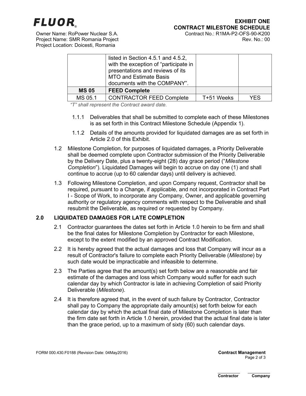 EXHIBIT ONE CONTRACT MILESTONE SCHEDULE Owner Name: RoPower Nuclear S.A. Contract No.: R1MA-P2-OFS-90-K200 Project Name: SMR Romania Project Rev. No.: 00 Project Location: Doicesti, Romania FORM 000.430.F0188 (Revision Date: 04May2016) Contract Management Page 2 of 3 __________ __________ Contractor Company listed in Section 4.5.1 and 4.5.2, with the exception of “participate in presentations and reviews of its MTO and Estimate Basis documents with the COMPANY”. MS 05 FEED Complete MS 05.1 CONTRACTOR FEED Complete T+51 Weeks YES “T” shall represent the Contract award date. 1.1.1 Deliverables that shall be submitted to complete each of these Milestones is as set forth in this Contract Milestone Schedule (Appendix 1). 1.1.2 Details of the amounts provided for liquidated damages are as set forth in Article 2.0 of this Exhibit. 1.2 Milestone Completion, for purposes of liquidated damages, a Priority Deliverable shall be deemed complete upon Contractor submission of the Priority Deliverable by the Delivery Date, plus a twenty-eight (28) day grace period (“Milestone Completion”). Liquidated Damages will begin to accrue on day one (1) and shall continue to accrue (up to 60 calendar days) until delivery is achieved. 1.3 Following Milestone Completion, and upon Company request, Contractor shall be required, pursuant to a Change, if applicable, and not incorporated in Contract Part I - Scope of Work, to incorporate any Company, Owner, and applicable governing authority or regulatory agency comments with respect to the Deliverable and shall resubmit the Deliverable, as required or requested by Company. 2.0 LIQUIDATED DAMAGES FOR LATE COMPLETION 2.1 Contractor guarantees the dates set forth in Article 1.0 herein to be firm and shall be the final dates for Milestone Completion by Contractor for each Milestone, except to the extent modified by an approved Contract Modification. 2.2 It is hereby agreed that the actual damages and loss that Company will incur as a result of Contractor's failure to complete each Priority Deliverable (Milestone) by such date would be impracticable and infeasible to determine. 2.3 The Parties agree that the amount(s) set forth below are a reasonable and fair estimate of the damages and loss which Company would suffer for each such calendar day by which Contractor is late in achieving Completion of said Priority Deliverable (Milestone). 2.4 It is therefore agreed that, in the event of such failure by Contractor, Contractor shall pay to Company the appropriate daily amount(s) set forth below for each calendar day by which the actual final date of Milestone Completion is later than the firm date set forth in Article 1.0 herein, provided that the actual final date is later than the grace period, up to a maximum of sixty (60) such calendar days.