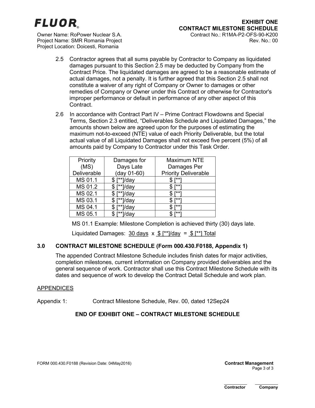 EXHIBIT ONE CONTRACT MILESTONE SCHEDULE Owner Name: RoPower Nuclear S.A. Contract No.: R1MA-P2-OFS-90-K200 Project Name: SMR Romania Project Rev. No.: 00 Project Location: Doicesti, Romania FORM 000.430.F0188 (Revision Date: 04May2016) Contract Management Page 3 of 3 __________ __________ Contractor Company 2.5 Contractor agrees that all sums payable by Contractor to Company as liquidated damages pursuant to this Section 2.5 may be deducted by Company from the Contract Price. The liquidated damages are agreed to be a reasonable estimate of actual damages, not a penalty. It is further agreed that this Section 2.5 shall not constitute a waiver of any right of Company or Owner to damages or other remedies of Company or Owner under this Contract or otherwise for Contractor's improper performance or default in performance of any other aspect of this Contract. 2.6 In accordance with Contract Part IV – Prime Contract Flowdowns and Special Terms, Section 2.3 entitled, “Deliverables Schedule and Liquidated Damages,” the amounts shown below are agreed upon for the purposes of estimating the maximum not-to-exceed (NTE) value of each Priority Deliverable, but the total actual value of all Liquidated Damages shall not exceed five percent (5%) of all amounts paid by Company to Contractor under this Task Order. Priority (MS) Deliverable Damages for Days Late (day 01-60) Maximum NTE Damages Per Priority Deliverable MS 01.1 $ [**]/day $ [**] MS 01.2 $ [**]/day $ [**] MS 02.1 $ [**]/day $ [**] MS 03.1 $ [**]/day $ [**] MS 04.1 $ [**]/day $ [**] MS 05.1 $ [**]/day $ [**] MS 01.1 Example: Milestone Completion is achieved thirty (30) days late. Liquidated Damages: 30 days x $ [**]/day = $ [**] Total 3.0 CONTRACT MILESTONE SCHEDULE (Form 000.430.F0188, Appendix 1) The appended Contract Milestone Schedule includes finish dates for major activities, completion milestones, current information on Company provided deliverables and the general sequence of work. Contractor shall use this Contract Milestone Schedule with its dates and sequence of work to develop the Contract Detail Schedule and work plan. APPENDICES Appendix 1: Contract Milestone Schedule, Rev. 00, dated 12Sep24 END OF EXHIBIT ONE – CONTRACT MILESTONE SCHEDULE