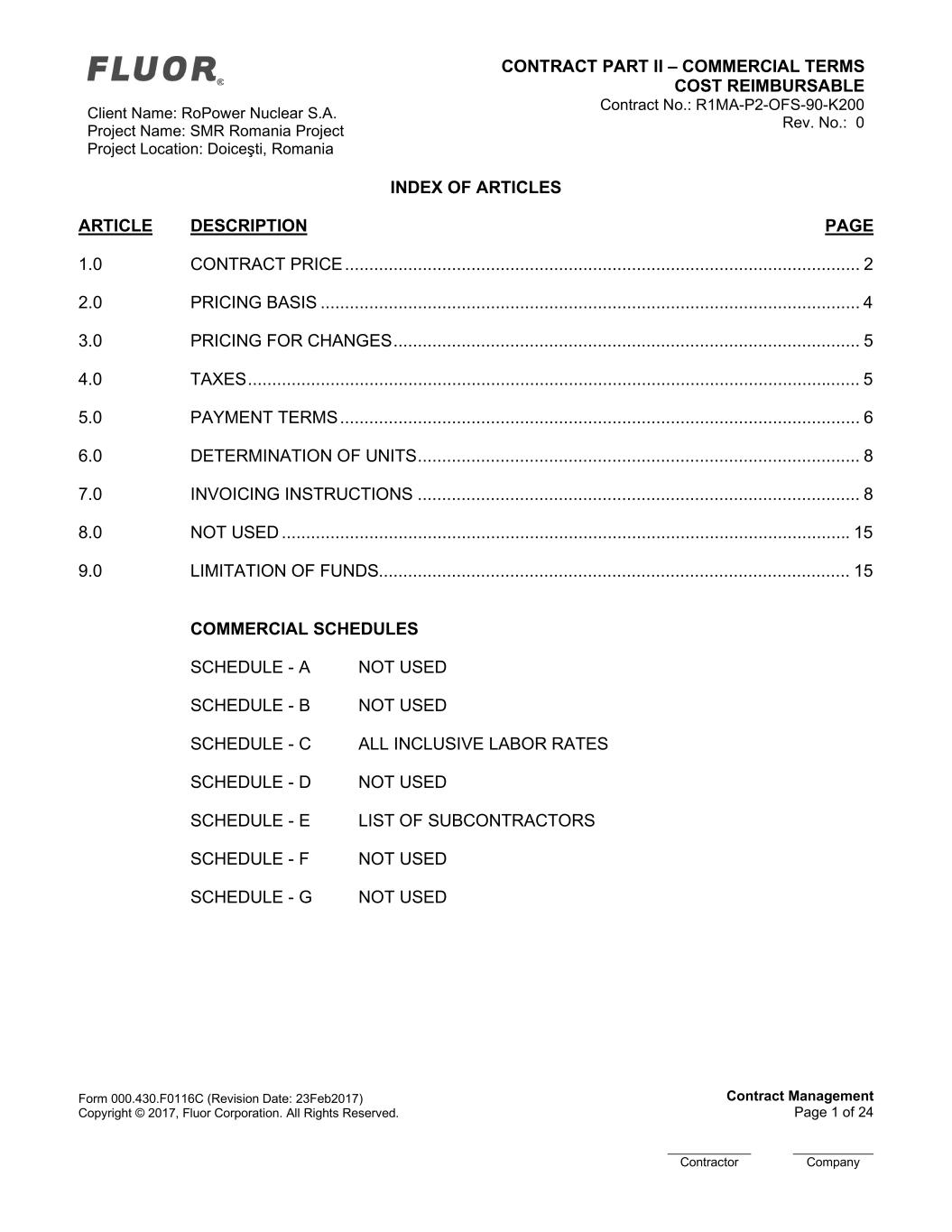 Client Name: RoPower Nuclear S.A. Project Name: SMR Romania Project Project Location: CONTRACT PART II – COMMERCIAL TERMS COST REIMBURSABLE Contract No.: R1MA-P2-OFS-90-K200 Rev. No.: 0 Form 000.430.F0116C (Revision Date: 23Feb2017) Copyright © 2017 Reserved. Contract Management Page 1 of 24 Contractor Company INDEX OF ARTICLES ARTICLE DESCRIPTION PAGE 1.0 CONTRACT PRICE.......................................................................................................... 2 2.0 PRICING BASIS ............................................................................................................... 4 3.0 PRICING FOR CHANGES................................................................................................ 5 4.0 TAXES.............................................................................................................................. 5 5.0 PAYMENT TERMS........................................................................................................... 6 6.0 DETERMINATION OF UNITS........................................................................................... 8 7.0 INVOICING INSTRUCTIONS ........................................................................................... 8 8.0 NOT USED ..................................................................................................................... 15 9.0 LIMITATION OF FUNDS................................................................................................. 15 COMMERCIAL SCHEDULES SCHEDULE - A NOT USED SCHEDULE - B NOT USED SCHEDULE - C ALL INCLUSIVE LABOR RATES SCHEDULE - D NOT USED SCHEDULE - E LIST OF SUBCONTRACTORS SCHEDULE - F NOT USED SCHEDULE - G NOT USED