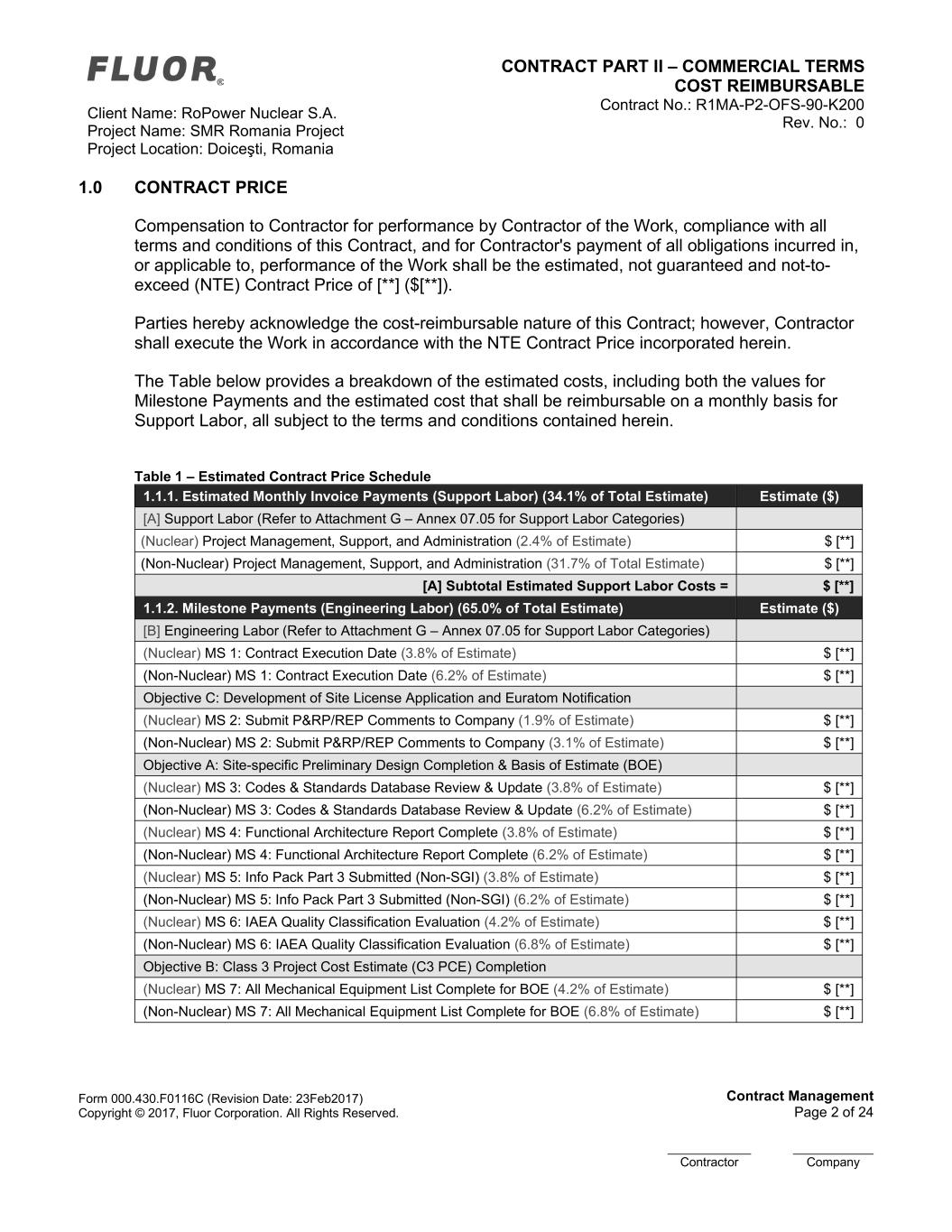 Client Name: RoPower Nuclear S.A. Project Name: SMR Romania Project Project Location: CONTRACT PART II – COMMERCIAL TERMS COST REIMBURSABLE Contract No.: R1MA-P2-OFS-90-K200 Rev. No.: 0 Form 000.430.F0116C (Revision Date: 23Feb2017) Copyright © 2017 Reserved. Contract Management Page 2 of 24 Contractor Company 1.0 CONTRACT PRICE C the not-to- exceed (NTE) Contract Price of [**] ($[**]). Parties hereby acknowledge the cost- Contractor shall execute the Work in accordance with the NTE Contract Price incorporated herein. Milestone Payments and the estimated cost that shall be reimbursable on a monthly basis for Support all subject to the terms and conditions contained herein. Table 1 – Estimated Contract Price Schedule 1.1.1. Estimated Monthly Invoice Payments (Support Labor) (34.1% of Total Estimate) Estimate ($) [A] Support Labor (Refer to Attachment G – Annex 07.05 for Support Labor Categories) (Nuclear) (2.4% of Estimate) $ [**] (Non-Nuclear) (31.7% of Total Estimate) $ [**] [A] Subtotal Estimated Support Labor Costs = $ [**] 1.1.2. Milestone Payments (Engineering Labor) (65.0% of Total Estimate) Estimate ($) [B] Engineering Labor (Refer to Attachment G – Annex 07.05 for Support Labor Categories) (Nuclear) MS 1: Contract Execution Date (3.8% of Estimate) $ [**] (Non-Nuclear) MS 1: Contract Execution Date (6.2% of Estimate) $ [**] Objective C: Development of Site License Application and Euratom Notification (Nuclear) MS 2: Submit P&RP/REP Comments to Company (1.9% of Estimate) $ [**] (Non-Nuclear) MS 2: Submit P&RP/REP Comments to Company (3.1% of Estimate) $ [**] Objective A: Site-specific Preliminary Design Completion & Basis of Estimate (BOE) (Nuclear) MS 3: Codes & Standards Database Review & Update (3.8% of Estimate) $ [**] (Non-Nuclear) MS 3: Codes & Standards Database Review & Update (6.2% of Estimate) $ [**] (Nuclear) MS 4: Functional Architecture Report Complete (3.8% of Estimate) $ [**] (Non-Nuclear) MS 4: Functional Architecture Report Complete (6.2% of Estimate) $ [**] (Nuclear) MS 5: Info Pack Part 3 Submitted (Non-SGI) (3.8% of Estimate) $ [**] (Non-Nuclear) MS 5: Info Pack Part 3 Submitted (Non-SGI) (6.2% of Estimate) $ [**] (Nuclear) MS 6: IAEA Quality Classification Evaluation (4.2% of Estimate) $ [**] (Non-Nuclear) MS 6: IAEA Quality Classification Evaluation (6.8% of Estimate) $ [**] Objective B: Class 3 Project Cost Estimate (C3 PCE) Completion (Nuclear) MS 7: All Mechanical Equipment List Complete for BOE (4.2% of Estimate) $ [**] (Non-Nuclear) MS 7: All Mechanical Equipment List Complete for BOE (6.8% of Estimate) $ [**]