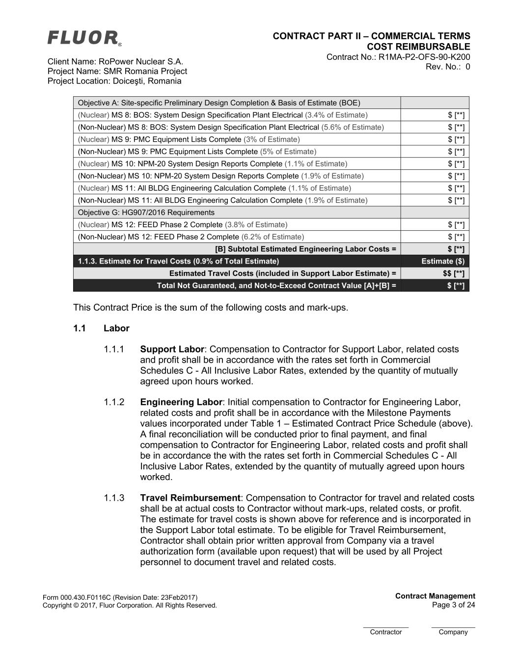 Client Name: RoPower Nuclear S.A. Project Name: SMR Romania Project Project Location: CONTRACT PART II – COMMERCIAL TERMS COST REIMBURSABLE Contract No.: R1MA-P2-OFS-90-K200 Rev. No.: 0 Form 000.430.F0116C (Revision Date: 23Feb2017) Copyright © 2017 Reserved. Contract Management Page 3 of 24 Contractor Company Objective A: Site-specific Preliminary Design Completion & Basis of Estimate (BOE) (Nuclear) MS 8: BOS: System Design Specification Plant Electrical (3.4% of Estimate) $ [**] (Non-Nuclear) MS 8: BOS: System Design Specification Plant Electrical (5.6% of Estimate) $ [**] (Nuclear) MS 9: PMC Equipment Lists Complete (3% of Estimate) $ [**] (Non-Nuclear) MS 9: PMC Equipment Lists Complete (5% of Estimate) $ [**] (Nuclear) MS 10: NPM-20 System Design Reports Complete (1.1% of Estimate) $ [**] (Non-Nuclear) MS 10: NPM-20 System Design Reports Complete (1.9% of Estimate) $ [**] (Nuclear) MS 11: All BLDG Engineering Calculation Complete (1.1% of Estimate) $ [**] (Non-Nuclear) MS 11: All BLDG Engineering Calculation Complete (1.9% of Estimate) $ [**] Objective G: HG907/2016 Requirements (Nuclear) MS 12: FEED Phase 2 Complete (3.8% of Estimate) $ [**] (Non-Nuclear) MS 12: FEED Phase 2 Complete (6.2% of Estimate) $ [**] [B] Subtotal Estimated Engineering Labor Costs = $ [**] 1.1.3. Estimate for Travel Costs (0.9% of Total Estimate) Estimate ($) Estimated Travel Costs (included in Support Labor Estimate) = $$ [**] Total Not Guaranteed, and Not-to-Exceed Contract Value [A]+[B] = $ [**] This Contract Price is the sum of the following costs and mark-ups. 1.1 Labor 1.1.1 Support Labor: Compensation to Contractor for Support related costs and profit shall be in accordance with the rates set forth in Commercial Schedules C - All Inclusive Labor Rates agreed upon hours worked. 1.1.2 Engineering Labor related costs and profit shall be in accordance with the Milestone Payments values incorporated under Table 1 – Estimated Contract Price Schedule (above). profit shall be in accordance the with the rates set forth in Commercial Schedules C - All Inclusive Labor Rates y of mutually agreed upon hours worked. 1.1.3 Travel Reimbursement: Compensation to Contractor for travel and related costs shall be at actual costs to Contractor without mark-ups related costs profit. The estimate for travel costs is shown above for reference and is incorporated in the Support Labor total estimate. To be eligible for Contractor shall obtain prior written approval from Company via a travel authorization form (available upon request) that will be used by all Project personnel to document travel and related costs.