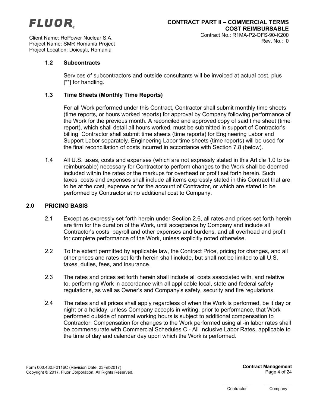 Client Name: RoPower Nuclear S.A. Project Name: SMR Romania Project Project Location: CONTRACT PART II – COMMERCIAL TERMS COST REIMBURSABLE Contract No.: R1MA-P2-OFS-90-K200 Rev. No.: 0 Form 000.430.F0116C (Revision Date: 23Feb2017) Copyright © 2017 Reserved. Contract Management Page 4 of 24 Contractor Company 1.2 Subcontracts Services of subcontractors and outside consultants will be invoiced at actual cost [**] for handling. 1.3 Time Sheets (Monthly Time Reports) monthly time sheets (time reports ) for approval by Company following performance of the Work for the previous month. A reconciled and approved copy of said time sheet (time report) billing. Contractor shall submit time sheets (time reports) for Engineering Labor and Support Labor separately. Engineering Labor time sheets (time reports) will be used for the final reconciliation of costs incurred in accordance with Section 7.8 (below). 1.4 All U.S. expenses (which are not expressly stated in this Article 1.0 to be reimbursable) necessary for Contractor to perform changes to the Work shall be deemed included within the rates or the markups for overhead or profit set forth herein. Such ontract that are performed by Contractor at no additional cost to Company. 2.0 PRICING BASIS 2.1 Except as expressly set forth herein under Section 2.6 all rates and prices set forth herein payroll and other expenses overhead and profit 2.2 other prices and rates set forth herein shall include all U.S. 2.3 tions. 2.4 performed outside of normal working hours is subject to additional compensation to Contractor. Compensation for changes to the Work performed using all-in labor rates shall be commensurate with Commercial Schedules C - All Inclusive Labor Rates the time of day and calendar day upon which the Work is performed.