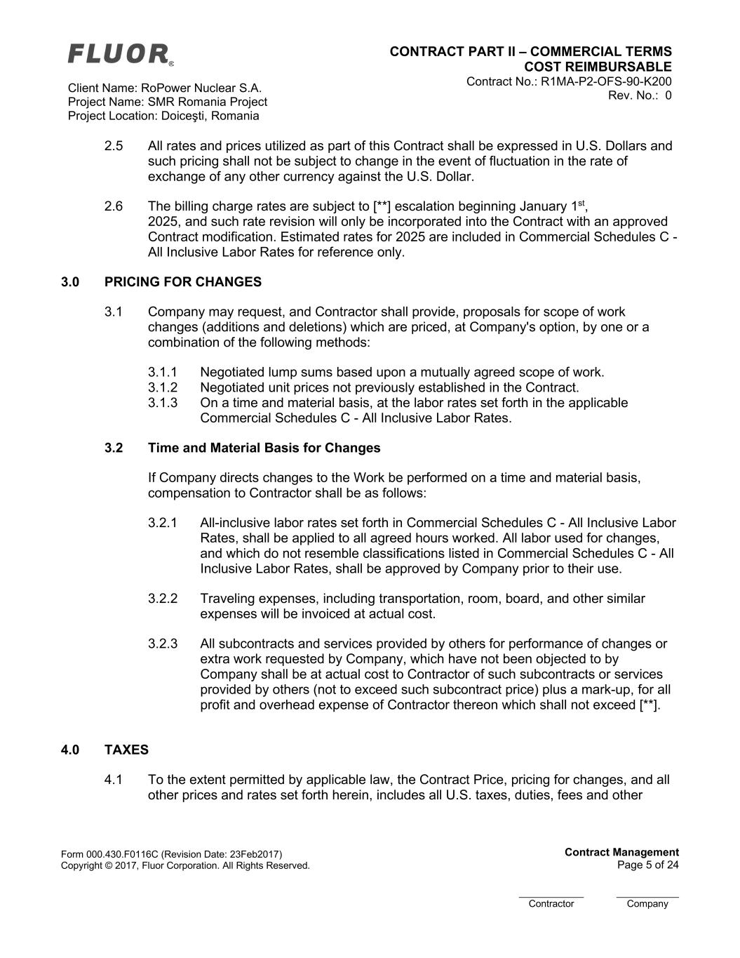 Client Name: RoPower Nuclear S.A. Project Name: SMR Romania Project Project Location: CONTRACT PART II – COMMERCIAL TERMS COST REIMBURSABLE Contract No.: R1MA-P2-OFS-90-K200 Rev. No.: 0 Form 000.430.F0116C (Revision Date: 23Feb2017) Copyright © 2017 Reserved. Contract Management Page 5 of 24 Contractor Company 2.5 All rates and prices utilized as part of this Contract shall be expressed in U.S. Dollars and such pricing shall not be subject to change in the event of fluctuation in the rate of exchange of any other currency against the U.S. Dollar. 2.6 The billing charge rates are subject to [**] escalation beginning January 1st 2025 will only be incorporated into the Contract with an approved Contract modification. Estimated rates for 2025 are included in Commercial Schedules C - All Inclusive Labor Rates for reference only. 3.0 PRICING FOR CHANGES 3.1 combination of the following methods: 3.1.1 Negotiated lump sums based upon a mutually agreed scope of work. 3.1.2 Negotiated unit prices not previously established in the Contract. 3.1.3 Commercial Schedules C - All Inclusive Labor Rates. 3.2 Time and Material Basis for Changes compensation to Contractor shall be as follows: 3.2.1 All-inclusive labor rates set forth in Commercial Schedules C - All Inclusive Labor Rates and which do not resemble classifications listed in Commercial Schedules C - All Inclusive Labor Rates shall be approved by Company prior to their use. 3.2.2 expenses will be invoiced at actual cost. 3.2.3 All subcontracts and services provided by others for performance of changes or Company shall be at actual cost to Contractor of such subcontracts or services provided by others (not to exceed such subcontract price) plus a mark- profit and overhead expense of Contractor thereon which shall not exceed [**]. 4.0 TAXES 4.1 To the extent permitted by applicable law the