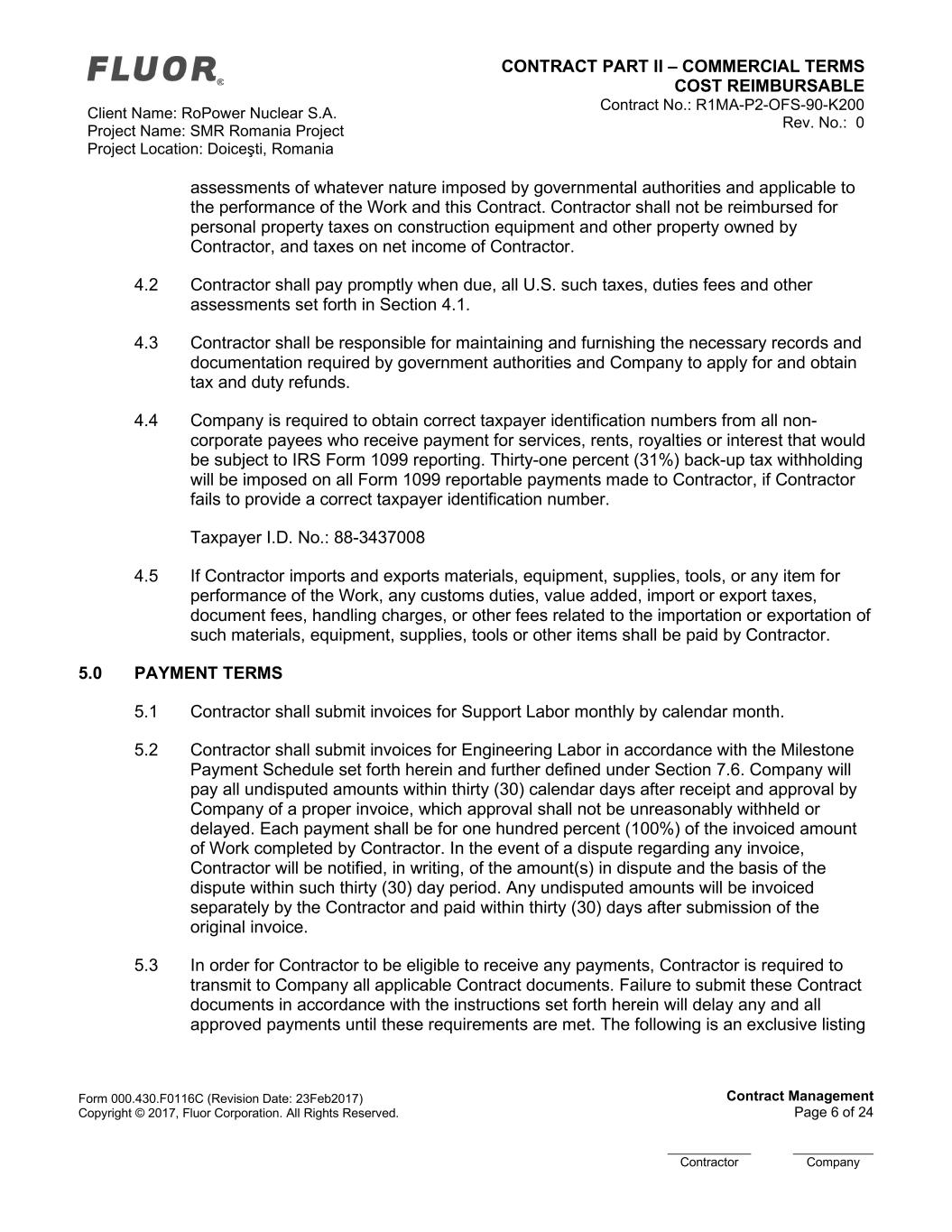 Client Name: RoPower Nuclear S.A. Project Name: SMR Romania Project Project Location: CONTRACT PART II – COMMERCIAL TERMS COST REIMBURSABLE Contract No.: R1MA-P2-OFS-90-K200 Rev. No.: 0 Form 000.430.F0116C (Revision Date: 23Feb2017) Copyright © 2017 Reserved. Contract Management Page 6 of 24 Contractor Company assessments of whatever nature imposed by governmental authorities and applicable to the performance of the Work and this Contract. Contractor shall not be reimbursed for personal property taxes on construction equipment and other property owned by Contrac 4.2 assessments set forth in Section 4.1. 4.3 Contractor shall be responsible for maintaining and furnishing the necessary records and documentation required by government authorities and Company to apply for and obtain tax and duty refunds. 4.4 Company is required to obtain correct taxpayer identification numbers from all non- be subject to IRS Form 1099 reporting. Thirty-one percent (31%) back-up tax withholding will be imposed on all Form fails to provide a correct taxpayer identification number. Taxpayer I.D. No.: 88-3437008 4.5 ion of 5.0 PAYMENT TERMS 5.1 Contractor shall submit invoices for Support Labor monthly by calendar month. 5.2 Contractor shall submit invoices for Engineering Labor in accordance with the Milestone Payment Schedule set forth herein and further defined under Section 7.6. Company will pay all undisputed amounts within thirty (30) calendar days after receipt and approval by delayed. Each payment shall be for one hundred percent (100%) of the invoiced amount of Work completed by Contractor. In the even dispute within such thirty (30) day period. Any undisputed amounts will be invoiced separately by the Contractor and paid within thirty (30) days after submission of the original invoice. 5.3 transmit to Company all applicable Contract documents. Failure to submit these Contract documents in accordance with the instructions set forth herein will delay any and all approved payments until these requirements are met. The following is an exclusive listing