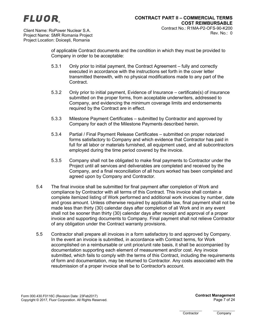 Client Name: RoPower Nuclear S.A. Project Name: SMR Romania Project Project Location: CONTRACT PART II – COMMERCIAL TERMS COST REIMBURSABLE Contract No.: R1MA-P2-OFS-90-K200 Rev. No.: 0 Form 000.430.F0116C (Revision Date: 23Feb2017) Copyright © 2017 Reserved. Contract Management Page 7 of 24 Contractor Company of applicable Contract documents and the condition in which they must be provided to Company in order to be acceptable: 5.3.1 Contract Agreement – fully and correctly executed in accordance with the instructions set forth in the cover letter Contract. 5.3.2 Evidence of Insurance – certificate(s) of insurance required by the Contract are in effect. 5.3.3 Milestone Payment Certificates – submitted by Contractor and approved by Company for each of the Milestone Payments described herein. 5.3.4 Partial / Final Payment Release Certificates – submitted on proper notarized forms satisfactory to Company and which evidence that Contractor has paid in employed during the time period covered by the invoice. 5.3.5 Company shall not be obligated to make final payments to Contractor under the Project until all services and deliverables are completed and received by the agreed upon by Company and Contractor. 5.4 The final invoice shall be submitted for final payment after completion of Work and compliance by Contractor with all terms of this Contract. This invoice shall contain a complete itemized listing of Work performed and gross amount. made less than thirty (30) calendar days after completion of all Work and in any event shall not be sooner than thirty (30) calendar days after receipt and approval of a proper invoice and supporting documents to Company. Final payment shall not relieve Contractor of any obligation under the Contract warranty provisions. 5.5 Contractor shall prepare all invoices in a form satisfactory to and approved by Company. documentation supporting each element of measurement and/or cost. Any invoice . Any costs associated with the