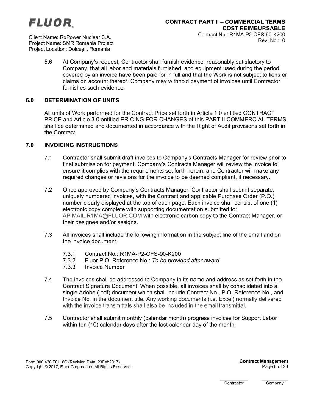 Client Name: RoPower Nuclear S.A. Project Name: SMR Romania Project Project Location: CONTRACT PART II – COMMERCIAL TERMS COST REIMBURSABLE Contract No.: R1MA-P2-OFS-90-K200 Rev. No.: 0 Form 000.430.F0116C (Revision Date: 23Feb2017) Copyright © 2017 Reserved. Contract Management Page 8 of 24 Contractor Company 5.6 reasonably satisfactory to covered by an invoice have been paid for in full and that the Work is not subject to liens or claims on account thereof. Company may withhold payment of invoices until Contractor furnishes such evidence. 6.0 DETERMINATION OF UNITS All units of Work performed for the Contract Price set forth in Article 1.0 entitled CONTRACT PRICE and Article 3.0 entitled PRICING FOR CHANGES of this PART shall be determined and documented in accordance with the Right of Audit provisions set forth in the Contract. 7.0 INVOICING INSTRUCTIONS 7.1 Contractor shall submit draft invoices to Company’s Contracts Manager for review prior to final submission for payment. Company’s Contracts Manager will review the invoice to ke any 7.2 Contractor shall submit uniquely and applicable Purchase Order (P.O.) number clearly displayed at the top of each page. Each invoice shall consist of one (1) electronic copy complete with supporting documentation submitted to: AP.MAIL.R1MA@FLUOR.COM with their designee and/or assigns. 7.3 All invoices shall include the following information in the subject line of the email and on the invoice document: 7.3.1 Contract No.: R1MA-P2-OFS-90-K200 7.3.2 Fluor P.O. Reference No.: To be provided after award 7.3.3 Invoice Number 7.4 The invoices shall be addressed to Company in its name and address as set forth in the Contract Signature Document. Invoice No. in the document title. Any working documents (i.e. Excel) normally delivered with the invoice transmittals shall also be included in the email transmittal. 7.5 Contractor shall submit monthly (calendar month) progress invoices for Support Labor within ten (10) calendar days after the last calendar day of the month.