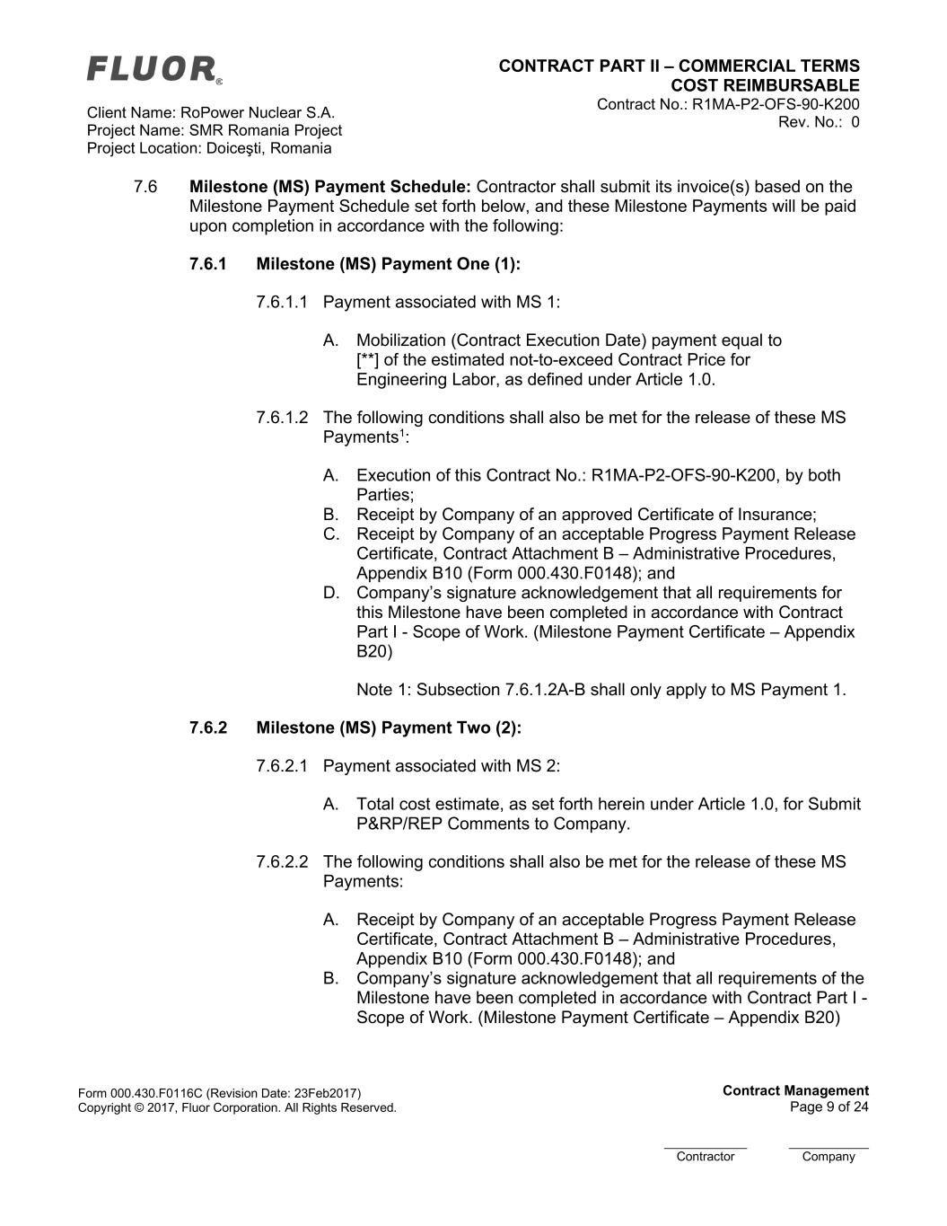 Client Name: RoPower Nuclear S.A. Project Name: SMR Romania Project Project Location: CONTRACT PART II – COMMERCIAL TERMS COST REIMBURSABLE Contract No.: R1MA-P2-OFS-90-K200 Rev. No.: 0 Form 000.430.F0116C (Revision Date: 23Feb2017) Copyright © 2017 Reserved. Contract Management Page 9 of 24 Contractor Company 7.6 Milestone (MS) Payment Schedule: Contractor shall submit its invoice(s) based on the be paid upon completion in accordance with the following: 7.6.1 Milestone (MS) Payment One (1): 7.6.1.1 Payment associated with MS 1: A. Mobilization (Contract Execution Date) payment equal to [**] of the estimated not-to-exceed Contract Price for Engineering Labor 7.6.1.2 The following conditions shall also be met for the release of these MS Payments1: A. Execution of this Contract No.: R1MA-P2-OFS-90-K200 Parties; B. Receipt by Company of an approved Certificate of Insurance; C. Receipt by Company of an acceptable Progress Payment Release – Appendix B10 (Form 000.430.F0148); and D. Company’s signature acknowledgement that all requirements for this Milestone have been completed in accordance with Contract Part I - Scope of Work. (Milestone Payment Certificate – Appendix B20) Note 1: Subsection 7.6.1.2A-B shall only apply to MS Payment 1. 7.6.2 Milestone (MS) Payment Two (2): 7.6.2.1 Payment associated with MS 2: A. Submit P&RP/REP Comments to Company. 7.6.2.2 The following conditions shall also be met for the release of these MS Payments: A. Receipt by Company of an acceptable Progress Payment Release – Appendix B10 (Form 000.430.F0148); and B. Company’s signature acknowledgement that all requirements of the Milestone have been completed in accordance with Contract Part I - Scope of Work. (Milestone Payment Certificate – Appendix B20)