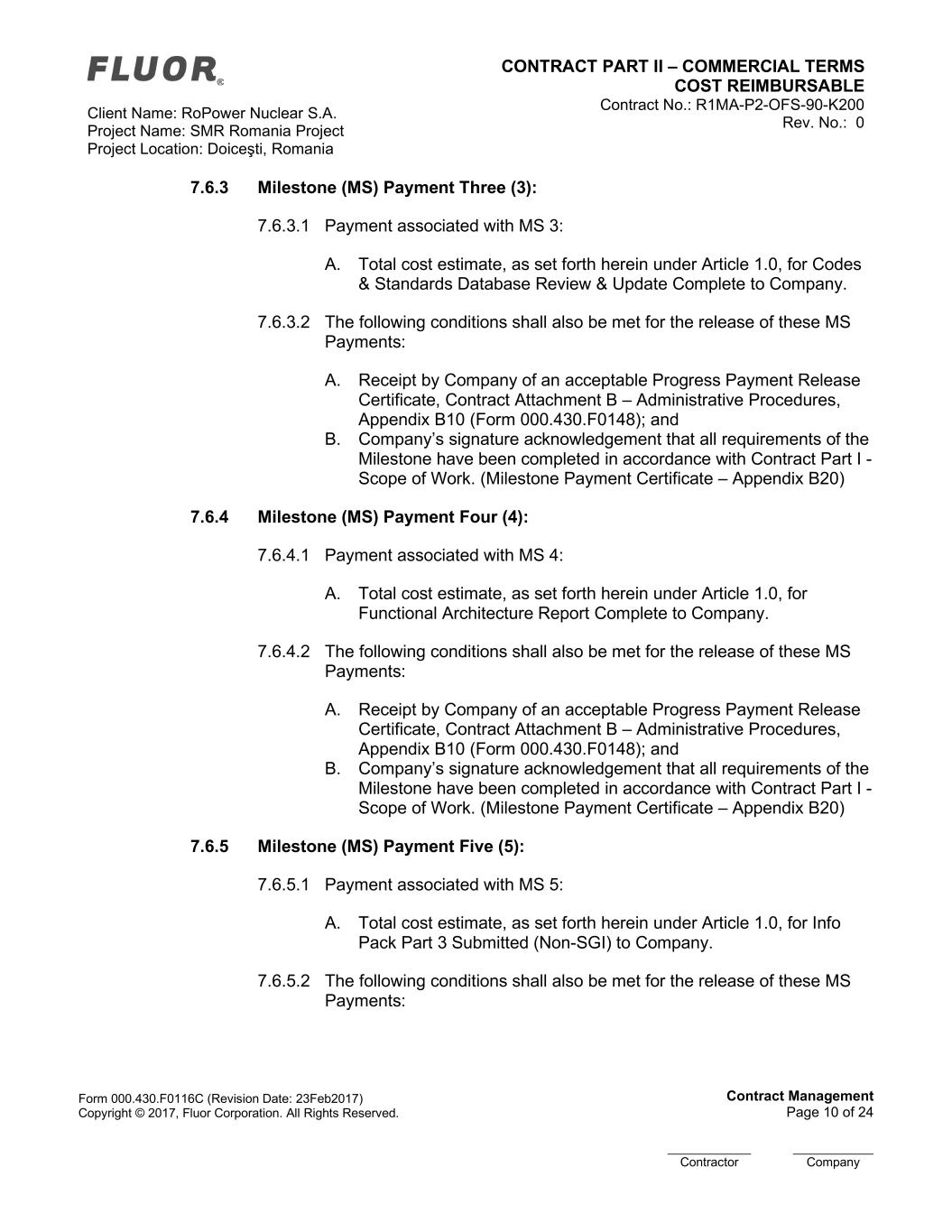 Client Name: RoPower Nuclear S.A. Project Name: SMR Romania Project Project Location: CONTRACT PART II – COMMERCIAL TERMS COST REIMBURSABLE Contract No.: R1MA-P2-OFS-90-K200 Rev. No.: 0 Form 000.430.F0116C (Revision Date: 23Feb2017) Copyright © 2017 Reserved. Contract Management Page 10 of 24 Contractor Company 7.6.3 Milestone (MS) Payment Three (3): 7.6.3.1 Payment associated with MS 3: A. Codes & Standards Database Review & Update Complete to Company. 7.6.3.2 The following conditions shall also be met for the release of these MS Payments: A. Receipt by Company of an acceptable Progress Payment Release – Appendix B10 (Form 000.430.F0148); and B. Company’s signature acknowledgement that all requirements of the Milestone have been completed in accordance with Contract Part I - Scope of Work. (Milestone Payment Certificate – Appendix B20) 7.6.4 Milestone (MS) Payment Four (4): 7.6.4.1 Payment associated with MS 4: A. Functional Architecture Report Complete to Company. 7.6.4.2 The following conditions shall also be met for the release of these MS Payments: A. Receipt by Company of an acceptable Progress Payment Release – Appendix B10 (Form 000.430.F0148); and B. Company’s signature acknowledgement that all requirements of the Milestone have been completed in accordance with Contract Part I - Scope of Work. (Milestone Payment Certificate – Appendix B20) 7.6.5 Milestone (MS) Payment Five (5): 7.6.5.1 Payment associated with MS 5: A. Info Pack Part 3 Submitted (Non-SGI) to Company. 7.6.5.2 The following conditions shall also be met for the release of these MS Payments: