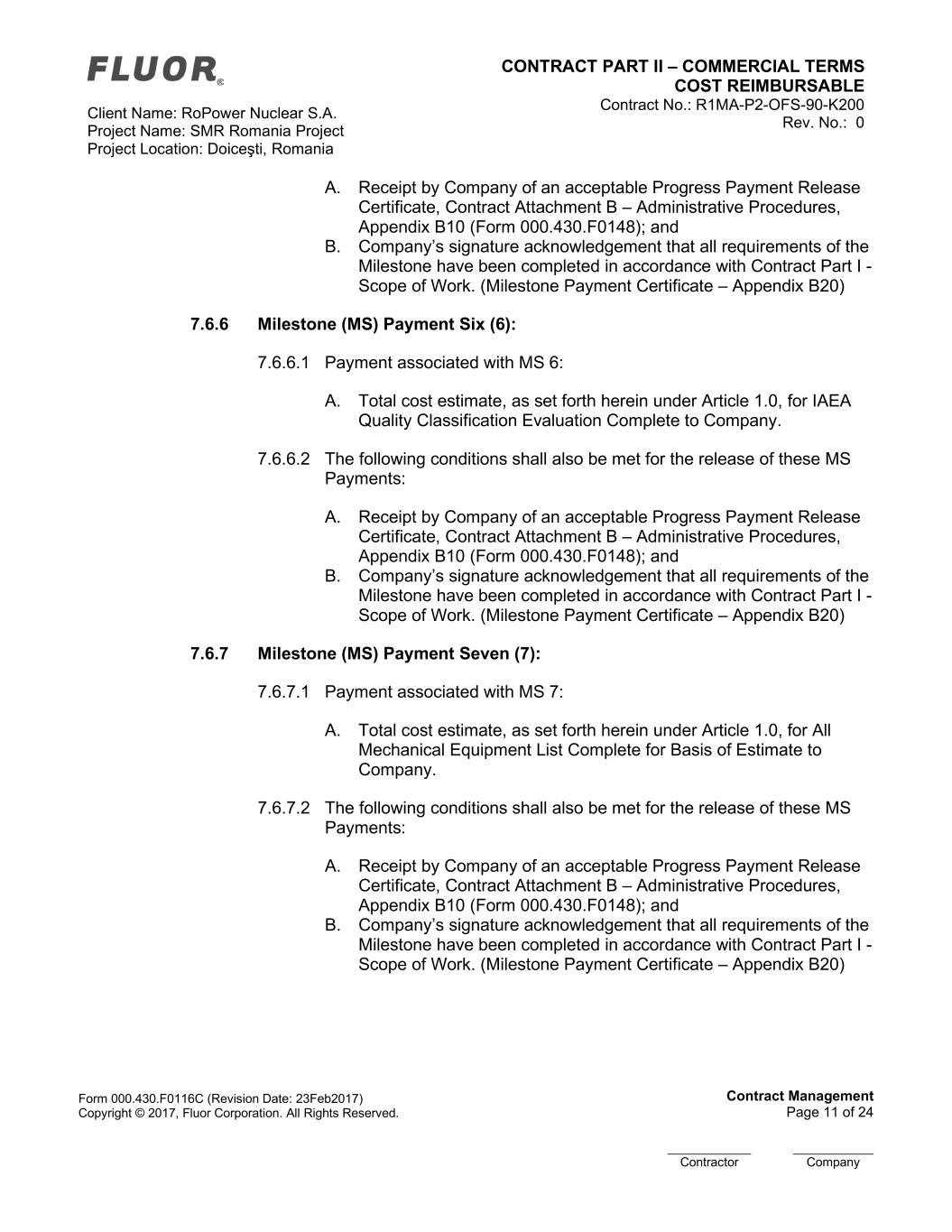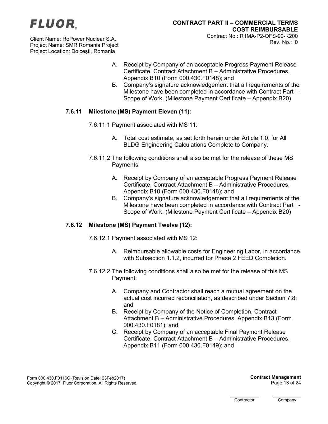 Client Name: RoPower Nuclear S.A. Project Name: SMR Romania Project Project Location: CONTRACT PART II – COMMERCIAL TERMS COST REIMBURSABLE Contract No.: R1MA-P2-OFS-90-K200 Rev. No.: 0 Form 000.430.F0116C (Revision Date: 23Feb2017) Copyright © 2017 Reserved. Contract Management Page 13 of 24 Contractor Company A. Receipt by Company of an acceptable Progress Payment Release – Appendix B10 (Form 000.430.F0148); and B. Company’s signature acknowledgement that all requirements of the Milestone have been completed in accordance with Contract Part I - Scope of Work. (Milestone Payment Certificate – Appendix B20) 7.6.11 Milestone (MS) Payment Eleven (11): 7.6.11.1 Payment associated with MS 11: A. All BLDG Engineering Calculations Complete to Company. 7.6.11.2 The following conditions shall also be met for the release of these MS Payments: A. Receipt by Company of an acceptable Progress Payment Release – Appendix B10 (Form 000.430.F0148); and B. Company’s signature acknowledgement that all requirements of the Milestone have been completed in accordance with Contract Part I - Scope of Work. (Milestone Payment Certificate – Appendix B20) 7.6.12 Milestone (MS) Payment Twelve (12): 7.6.12.1 Payment associated with MS 12: A. Reimbursable allowable costs with Subsection 1.1.2 incurred for Phase 2 FEED Completion. 7.6.12.2 The following conditions shall also be met for the release of this MS Payment: A. Company and Contractor shall reach a mutual agreement on the 7.8; and B. Attachment B – (Form 000.430.F0181); and C. Receipt by Company of an acceptable Final Payment Release – Appendix B11 (Form 000.430.F0149); and