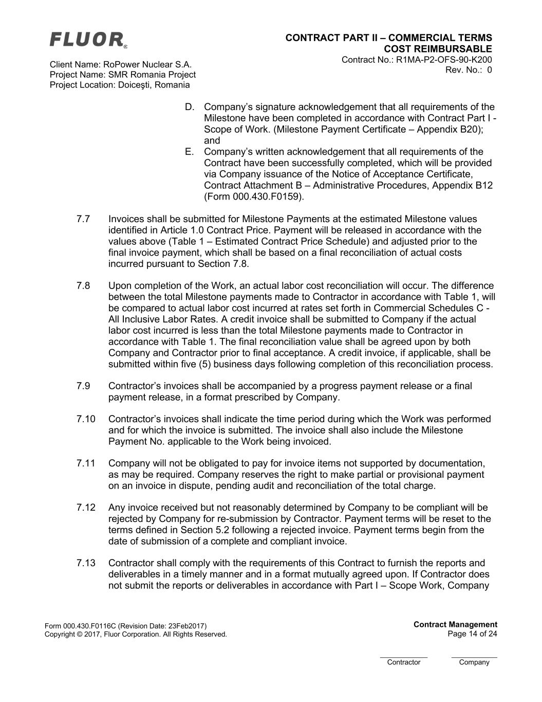 Client Name: RoPower Nuclear S.A. Project Name: SMR Romania Project Project Location: CONTRACT PART II – COMMERCIAL TERMS COST REIMBURSABLE Contract No.: R1MA-P2-OFS-90-K200 Rev. No.: 0 Form 000.430.F0116C (Revision Date: 23Feb2017) Copyright © 2017 Reserved. Contract Management Page 14 of 24 Contractor Company D. Company’s signature acknowledgement that all requirements of the Milestone have been completed in accordance with Contract Part I - Scope of Work. (Milestone Payment Certificate – Appendix B20); and E. Company’s written acknowledgement that all requirements of the Contract have been successfully completed Contract Attachment B – (Form 000.430.F0159). 7.7 Invoices shall be submitted for Milestone Payments at the estimated Milestone values identified in Article 1.0 Contract Price. Payment will be released in accordance with the values above (Table 1 – Estimated Contract Price Schedule) and adjusted prior to the final incurred pursuant to Section 7.8. 7.8 Upon completion of the Work n actual labor cost reconciliation will occur. The difference between the total Milestone payments made to Contractor in accordance with Table 1 will be compared to actual labor cost incurred at rates set forth in Commercial Schedules C - All Inclusive Labor Rates. A credit invoice shall be submitted to Company if the actual labor cost incurred is less than the total Milestone payments made to Contractor in accordance with Table 1. The final reconciliation value shall be agreed upon by both Company and Contractor prior to final acceptance. A credit invoice shall be submitted within five (5) business days following completion of this reconciliation process. 7.9 Contractor’s invoices shall be accompanied by a progress payment release or a final payment release . 7.10 Contractor’s invoices shall indicate the time period during which the Work was performed and for which the invoice is submitted. The invoice shall also include the Milestone Payment No. applicable to the Work being invoiced. 7.11 as may be required. Company reserves the right to make partial or provisional payment 7.12 Any invoice received but not reasonably determined by Company to be compliant will be rejected by Company for re-submission by Contractor. Payment terms will be reset to the terms defined in Section 5.2 following a rejected invoice. Payment terms begin from the date of submission of a complete and compliant invoice. 7.13 Contractor shall comply with the requirements of this Contract to furnish the reports and deliverables in a timely manner and in a format mutually agreed upon. If Contractor does not submit the reports or deliverables in accordance with Part I – Company