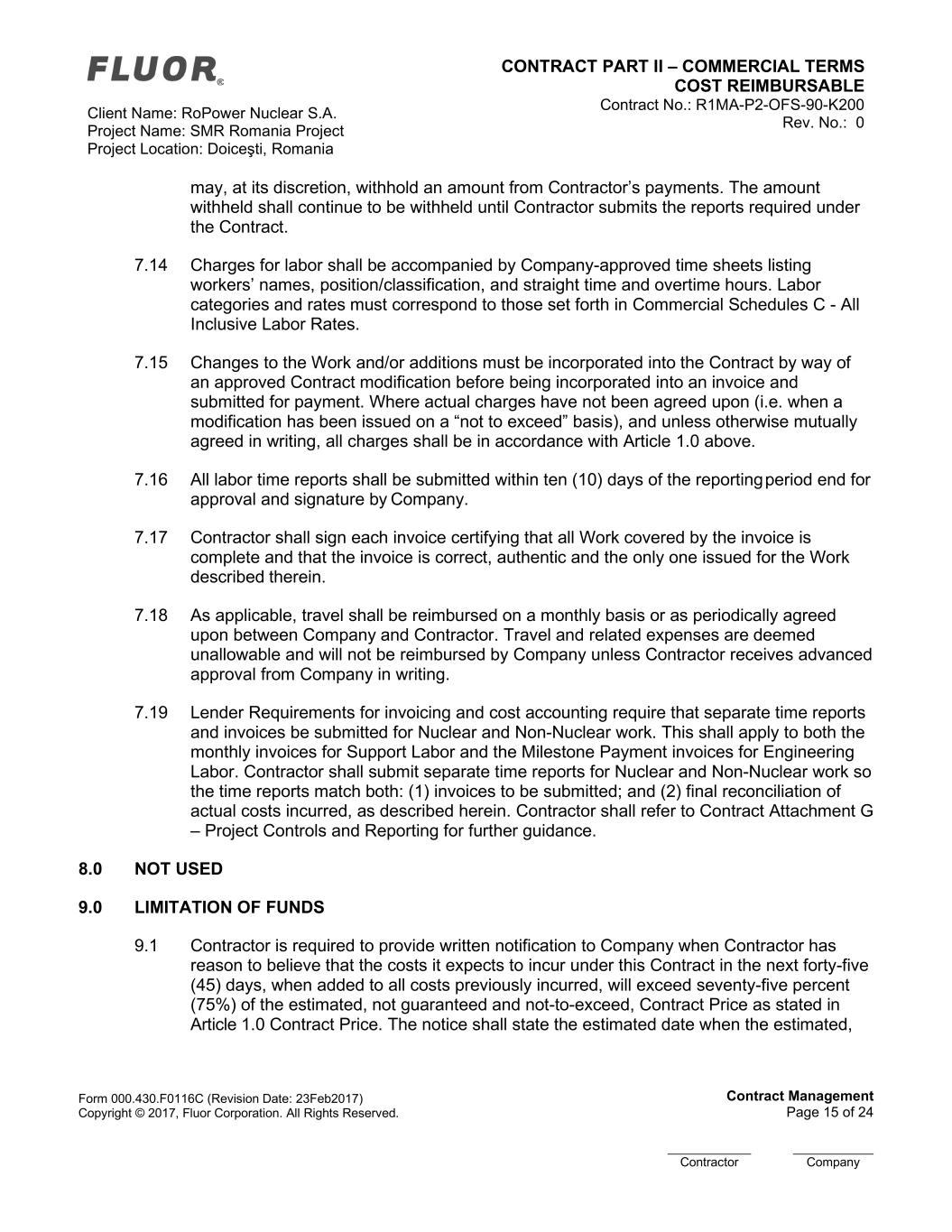 Client Name: RoPower Nuclear S.A. Project Name: SMR Romania Project Project Location: CONTRACT PART II – COMMERCIAL TERMS COST REIMBURSABLE Contract No.: R1MA-P2-OFS-90-K200 Rev. No.: 0 Form 000.430.F0116C (Revision Date: 23Feb2017) Copyright © 2017 Reserved. Contract Management Page 15 of 24 Contractor Company . The amount withheld shall continue to be withheld until Contractor submits the reports required under the Contract. 7.14 Charges for labor shall be accompanied by Company-approved time sheets listing position/ categories and rates must correspond to those set forth in Commercial Schedules C - All Inclusive Labor Rates. 7.15 Changes to the Work and/or additions must be incorporated into the Contract by way of an approved Contract modification before being incorporated into an invoice and submitted for payment. Where actual charges have not been agreed upon (i.e. when a modific and unless otherwise mutually 1.0 above. 7.16 All labor time reports shall be submitted within ten (10) days of the reportingperiod end for approval and signature by Company. 7.17 Contractor shall sign each invoice certifying that all Work covered by the invoice is described therein. 7.18 ravel shall be reimbursed on a monthly basis or as periodically agreed upon between Company and Contractor. Travel and related expenses are deemed unallowable and will not be reimbursed by Company unless Contractor receives advanced approval from Company in writing. 7.19 Lender Requirements for invoicing and cost accounting require that separate time reports and invoices be submitted for Nuclear and Non-Nuclear work. This shall apply to both the monthly invoices for Support Labor and the Milestone Payment invoices for Engineering Labor. Contractor shall submit separate time reports for Nuclear and Non-Nuclear work so the time reports match both: (1) invoices to be submitted; and (2) final reconciliation of Contractor shall refer to Contract Attachment G – Project Controls and Reporting for further guidance. 8.0 NOT USED 9.0 LIMITATION OF FUNDS 9.1 Contractor is required to provide written notification to Company when Contractor has reason to believe that the costs it expects to incur under this Contract in the next forty-five y-five percent (75%) of -to- as stated in Article 1.0 Contract Price. The notice shall state the estimated date when the estimated