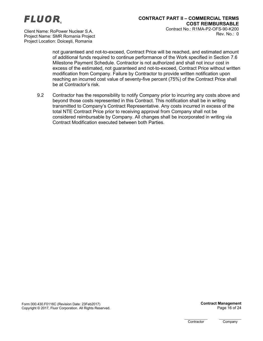 Client Name: RoPower Nuclear S.A. Project Name: SMR Romania Project Project Location: CONTRACT PART II – COMMERCIAL TERMS COST REIMBURSABLE Contract No.: R1MA-P2-OFS-90-K200 Rev. No.: 0 Form 000.430.F0116C (Revision Date: 23Feb2017) Copyright © 2017 Reserved. Contract Management Page 16 of 24 Contractor Company not guaranteed and not-to- of additional funds required to continue performance of the Work specified in Section 7.6 Milestone Payment Schedule. Contractor is not authorized and shall not incur cost in excess of the -to- without written modification from Company. Failure by Contractor to provide written notification upon reaching an incurred cost value of seventy-five percent (75%) of the Contract Price shall be at Contractor’s risk. 9.2 Contractor has the responsibility to notify Company prior to incurring any costs above and beyond those costs represented in this Contract. This notification shall be in writing transmitted to Company’s Contract Representative. Any costs incurred in excess of the total NTE Contract Price prior to receiving approval from Company shall not be considered reimbursable by Company. All changes shall be incorporated in writing via Contract Modification executed between both Parties.
