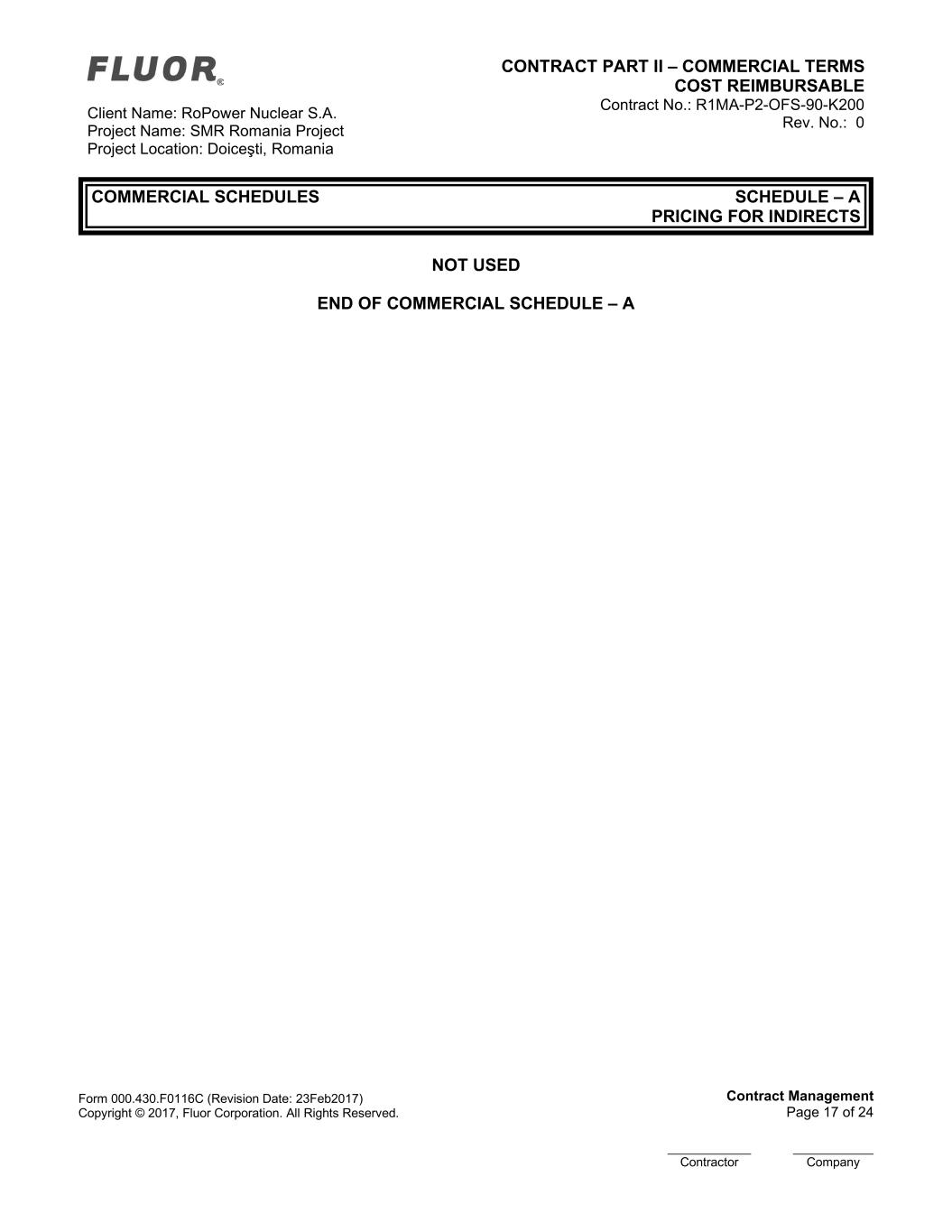 Client Name: RoPower Nuclear S.A. Project Name: SMR Romania Project Project Location: CONTRACT PART II – COMMERCIAL TERMS COST REIMBURSABLE Contract No.: R1MA-P2-OFS-90-K200 Rev. No.: 0 COMMERCIAL SCHEDULES SCHEDULE – A PRICING FOR INDIRECTS Form 000.430.F0116C (Revision Date: 23Feb2017) Copyright © 2017 Reserved. Contract Management Page 17 of 24 Contractor Company NOT USED END OF COMMERCIAL SCHEDULE – A