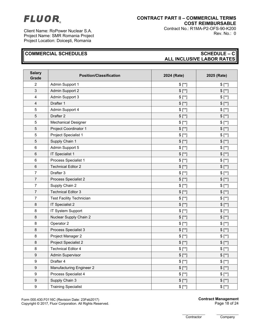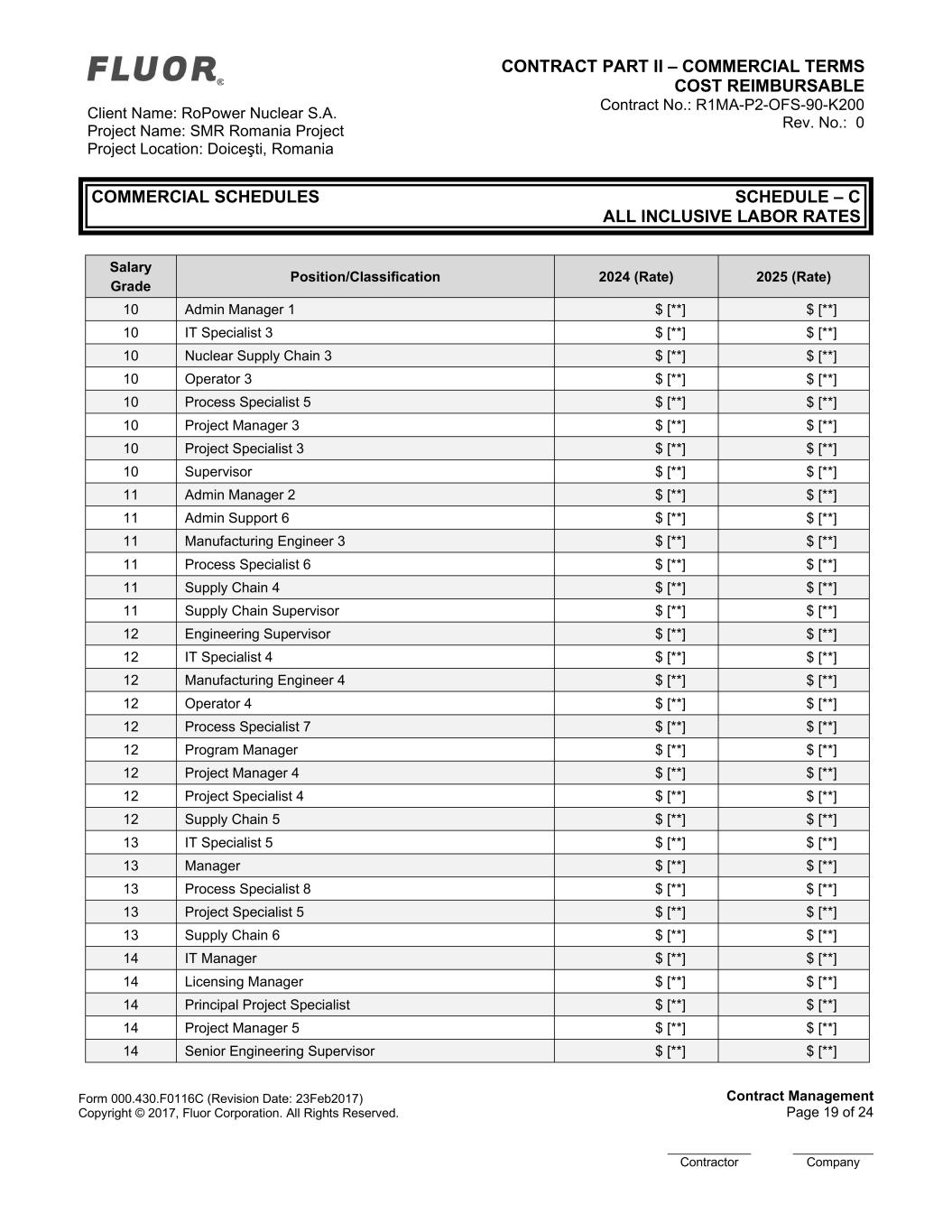 Client Name: RoPower Nuclear S.A. Project Name: SMR Romania Project Project Location: CONTRACT PART II – COMMERCIAL TERMS COST REIMBURSABLE Contract No.: R1MA-P2-OFS-90-K200 Rev. No.: 0 COMMERCIAL SCHEDULES SCHEDULE – C ALL INCLUSIVE LABOR RATES Form 000.430.F0116C (Revision Date: 23Feb2017) Copyright © 2017 Contract Management Page 19 of 24 Contractor Company Salary Grade Position/Classification 2024 (Rate) 2025 (Rate) 10 Admin Manager 1 $ [**] $ [**] 10 IT Specialist 3 $ [**] $ [**] 10 Nuclear Supply Chain 3 $ [**] $ [**] 10 Operator 3 $ [**] $ [**] 10 Process Specialist 5 $ [**] $ [**] 10 Project Manager 3 $ [**] $ [**] 10 Project Specialist 3 $ [**] $ [**] 10 Supervisor $ [**] $ [**] 11 Admin Manager 2 $ [**] $ [**] 11 Admin Support 6 $ [**] $ [**] 11 Manufacturing Engineer 3 $ [**] $ [**] 11 Process Specialist 6 $ [**] $ [**] 11 Supply Chain 4 $ [**] $ [**] 11 Supply Chain Supervisor $ [**] $ [**] 12 Engineering Supervisor $ [**] $ [**] 12 IT Specialist 4 $ [**] $ [**] 12 Manufacturing Engineer 4 $ [**] $ [**] 12 Operator 4 $ [**] $ [**] 12 Process Specialist 7 $ [**] $ [**] 12 Program Manager $ [**] $ [**] 12 Project Manager 4 $ [**] $ [**] 12 Project Specialist 4 $ [**] $ [**] 12 Supply Chain 5 $ [**] $ [**] 13 IT Specialist 5 $ [**] $ [**] 13 Manager $ [**] $ [**] 13 Process Specialist 8 $ [**] $ [**] 13 Project Specialist 5 $ [**] $ [**] 13 Supply Chain 6 $ [**] $ [**] 14 IT Manager $ [**] $ [**] 14 Licensing Manager $ [**] $ [**] 14 Principal Project Specialist $ [**] $ [**] 14 Project Manager 5 $ [**] $ [**] 14 Senior Engineering Supervisor $ [**] $ [**]