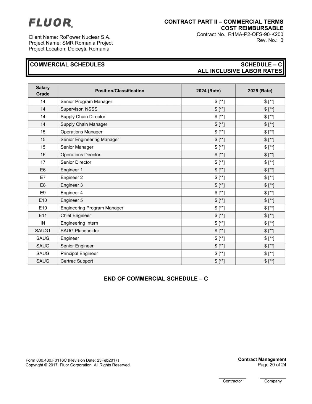 Client Name: RoPower Nuclear S.A. Project Name: SMR Romania Project Project Location: CONTRACT PART II – COMMERCIAL TERMS COST REIMBURSABLE Contract No.: R1MA-P2-OFS-90-K200 Rev. No.: 0 COMMERCIAL SCHEDULES SCHEDULE – C ALL INCLUSIVE LABOR RATES Form 000.430.F0116C (Revision Date: 23Feb2017) Copyright © 2017 Contract Management Page 20 of 24 Contractor Company Salary Grade Position/Classification 2024 (Rate) 2025 (Rate) 14 Senior Program Manager $ [**] $ [**] 14 $ [**] $ [**] 14 Supply Chain Director $ [**] $ [**] 14 Supply Chain Manager $ [**] $ [**] 15 Operations Manager $ [**] $ [**] 15 Senior Engineering Manager $ [**] $ [**] 15 Senior Manager $ [**] $ [**] 16 Operations Director $ [**] $ [**] 17 Senior Director $ [**] $ [**] E6 Engineer 1 $ [**] $ [**] E7 Engineer 2 $ [**] $ [**] E8 Engineer 3 $ [**] $ [**] E9 Engineer 4 $ [**] $ [**] E10 Engineer 5 $ [**] $ [**] E10 Engineering Program Manager $ [**] $ [**] E11 Chief Engineer $ [**] $ [**] IN Engineering Intern $ [**] $ [**] SAUG1 SAUG Placeholder $ [**] $ [**] SAUG Engineer $ [**] $ [**] SAUG Senior Engineer $ [**] $ [**] SAUG Principal Engineer $ [**] $ [**] SAUG Certrec Support $ [**] $ [**] END OF COMMERCIAL SCHEDULE – C