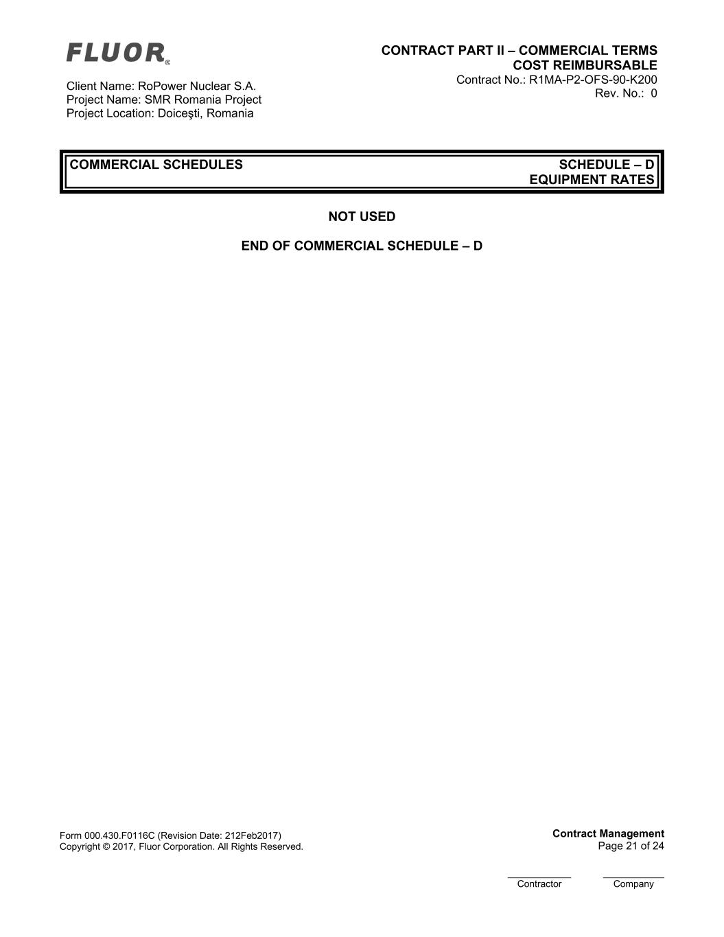 Client Name: RoPower Nuclear S.A. Project Name: SMR Romania Project Project Location: CONTRACT PART II – COMMERCIAL TERMS COST REIMBURSABLE Contract No.: R1MA-P2-OFS-90-K200 Rev. No.: 0 COMMERCIAL SCHEDULES SCHEDULE – D EQUIPMENT RATES Form 000.430.F0116C (Revision Date: 212Feb2017) Copyright © 2017 Contract Management Page 21 of 24 Contractor Company NOT USED END OF COMMERCIAL SCHEDULE – D