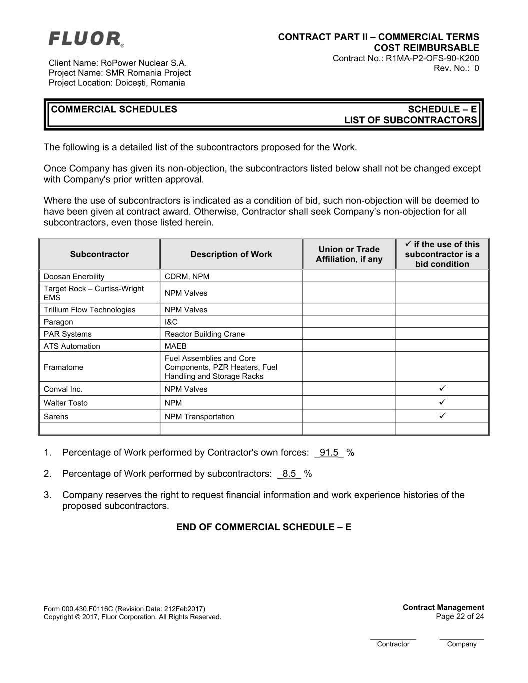 Client Name: RoPower Nuclear S.A. Project Name: SMR Romania Project Project Location: CONTRACT PART II – COMMERCIAL TERMS COST REIMBURSABLE Contract No.: R1MA-P2-OFS-90-K200 Rev. No.: 0 COMMERCIAL SCHEDULES SCHEDULE – E LIST OF SUBCONTRACTORS Form 000.430.F0116C (Revision Date: 212Feb2017) Copyright © 2017 Contract Management Page 22 of 24 Contractor Company The following is a detailed list of the subcontractors proposed for the Work. Once Company has given its non- -objection will be deemed to -objection for all Subcontractor Description of Work Union or Trade Affiliation, if any if the use of this subcontractor is a bid condition Doosan Enerbility Target Rock – Curtiss-Wright EMS NPM Valves Trillium Flow Technologies NPM Valves Paragon I&C PAR Systems Reactor Building Crane ATS Automation MAEB Framatome Fuel Assemblies and Core Handling and Storage Racks Conval Inc. NPM Valves Walter Tosto NPM Sarens NPM Transportation 1. _91.5_ % 2. Percentage of Work performed by subcontractors: _8.5_ % 3. Company reserves the right to request financial information and work experience histories of the proposed subcontractors. END OF COMMERCIAL SCHEDULE – E