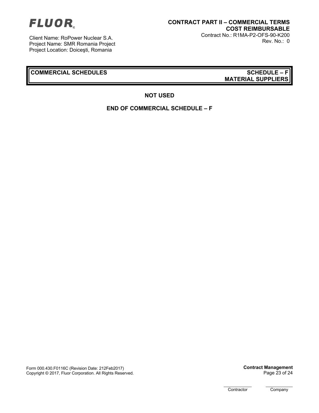 Client Name: RoPower Nuclear S.A. Project Name: SMR Romania Project Project Location: CONTRACT PART II – COMMERCIAL TERMS COST REIMBURSABLE Contract No.: R1MA-P2-OFS-90-K200 Rev. No.: 0 COMMERCIAL SCHEDULES SCHEDULE – F MATERIAL SUPPLIERS Form 000.430.F0116C (Revision Date: 212Feb2017) Copyright © 2017 Contract Management Page 23 of 24 Contractor Company NOT USED END OF COMMERCIAL SCHEDULE – F
