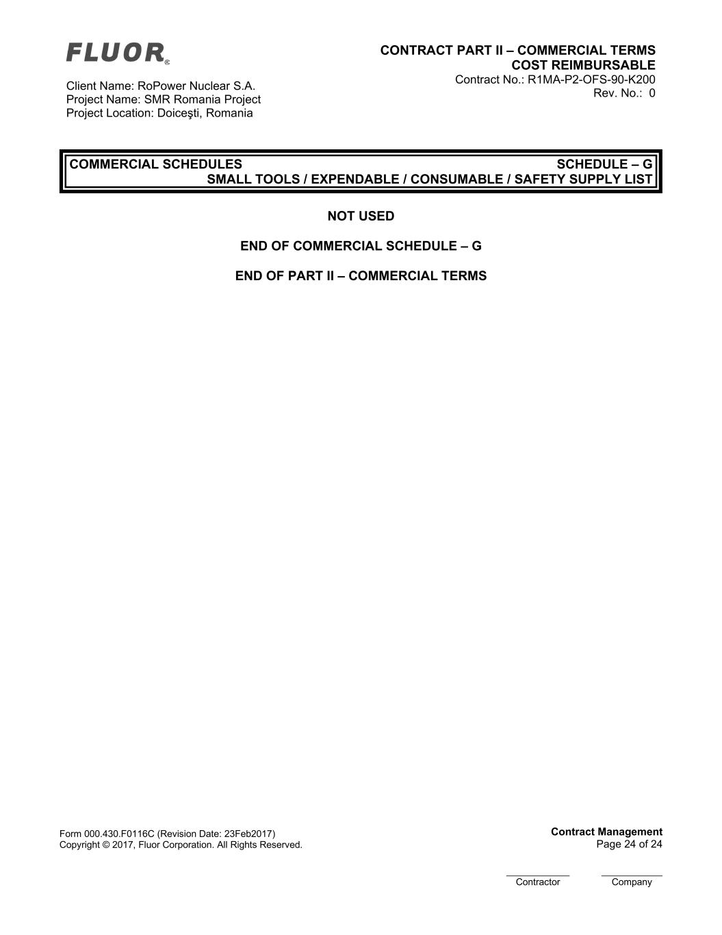 Client Name: RoPower Nuclear S.A. Project Name: SMR Romania Project Project Location: CONTRACT PART II – COMMERCIAL TERMS COST REIMBURSABLE Contract No.: R1MA-P2-OFS-90-K200 Rev. No.: 0 COMMERCIAL SCHEDULES SCHEDULE – G SMALL TOOLS / EXPENDABLE / CONSUMABLE / SAFETY SUPPLY LIST Form 000.430.F0116C (Revision Date: 23Feb2017) Copyright © 2017 Contract Management Page 24 of 24 Contractor Company NOT USED END OF COMMERCIAL SCHEDULE – G END OF PART II – COMMERCIAL TERMS
