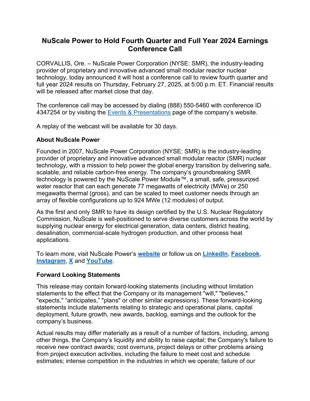 NuScale Power to Hold Fourth Quarter and Full Year 2024 Earnings Conference Call CORVALLIS, Ore. – NuScale Power Corporation (NYSE: SMR), the industry-leading provider of proprietary and innovative advanced small modular reactor nuclear technology, today announced it will host a conference call to review fourth quarter and full year 2024 results on Thursday, February 27, 2025, at 5:00 p.m. ET. Financial results will be released after market close that day. The conference call may be accessed by dialing (888) 550-5460 with conference ID 4347254 or by visiting the Events & Presentations page of the company’s website. A replay of the webcast will be available for 30 days. About NuScale Power Founded in 2007, NuScale Power Corporation (NYSE: SMR) is the industry-leading provider of proprietary and innovative advanced small modular reactor (SMR) nuclear technology, with a mission to help power the global energy transition by delivering safe, scalable, and reliable carbon-free energy. The company’s groundbreaking SMR technology is powered by the NuScale Power Module™, a small, safe, pressurized water reactor that can each generate 77 megawatts of electricity (MWe) or 250 megawatts thermal (gross), and can be scaled to meet customer needs through an array of flexible configurations up to 924 MWe (12 modules) of output. As the first and only SMR to have its design certified by the U.S. Nuclear Regulatory Commission, NuScale is well-positioned to serve diverse customers across the world by supplying nuclear energy for electrical generation, data centers, district heating, desalination, commercial-scale hydrogen production, and other process heat applications. To learn more, visit NuScale Power’s website or follow us on LinkedIn, Facebook, Instagram, X and YouTube. Forward Looking Statements This release may contain forward-looking statements (including without limitation statements to the effect that the Company or its management "will," "believes," "expects," “anticipates,” "plans" or other similar expressions). These forward-looking statements include statements relating to strategic and operational plans, capital deployment, future growth, new awards, backlog, earnings and the outlook for the company’s business. Actual results may differ materially as a result of a number of factors, including, among other things, the Company’s liquidity and ability to raise capital; the Company's failure to receive new contract awards; cost overruns, project delays or other problems arising from project execution activities, including the failure to meet cost and schedule estimates; intense competition in the industries in which we operate; failure of our