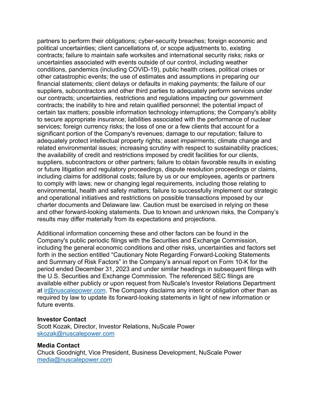 partners to perform their obligations; cyber-security breaches; foreign economic and political uncertainties; client cancellations of, or scope adjustments to, existing contracts; failure to maintain safe worksites and international security risks; risks or uncertainties associated with events outside of our control, including weather conditions, pandemics (including COVID-19), public health crises, political crises or other catastrophic events; the use of estimates and assumptions in preparing our financial statements; client delays or defaults in making payments; the failure of our suppliers, subcontractors and other third parties to adequately perform services under our contracts; uncertainties, restrictions and regulations impacting our government contracts; the inability to hire and retain qualified personnel; the potential impact of certain tax matters; possible information technology interruptions; the Company's ability to secure appropriate insurance; liabilities associated with the performance of nuclear services; foreign currency risks; the loss of one or a few clients that account for a significant portion of the Company's revenues; damage to our reputation; failure to adequately protect intellectual property rights; asset impairments; climate change and related environmental issues; increasing scrutiny with respect to sustainability practices; the availability of credit and restrictions imposed by credit facilities for our clients, suppliers, subcontractors or other partners; failure to obtain favorable results in existing or future litigation and regulatory proceedings, dispute resolution proceedings or claims, including claims for additional costs; failure by us or our employees, agents or partners to comply with laws; new or changing legal requirements, including those relating to environmental, health and safety matters; failure to successfully implement our strategic and operational initiatives and restrictions on possible transactions imposed by our charter documents and Delaware law. Caution must be exercised in relying on these and other forward-looking statements. Due to known and unknown risks, the Company’s results may differ materially from its expectations and projections. Additional information concerning these and other factors can be found in the Company's public periodic filings with the Securities and Exchange Commission, including the general economic conditions and other risks, uncertainties and factors set forth in the section entitled “Cautionary Note Regarding Forward-Looking Statements and Summary of Risk Factors” in the Company’s annual report on Form 10-K for the period ended December 31, 2023 and under similar headings in subsequent filings with the U.S. Securities and Exchange Commission. The referenced SEC filings are available either publicly or upon request from NuScale's Investor Relations Department at ir@nuscalepower.com. The Company disclaims any intent or obligation other than as required by law to update its forward-looking statements in light of new information or future events. Investor Contact Scott Kozak, Director, Investor Relations, NuScale Power skozak@nuscalepower.com Media Contact Chuck Goodnight, Vice President, Business Development, NuScale Power media@nuscalepower.com